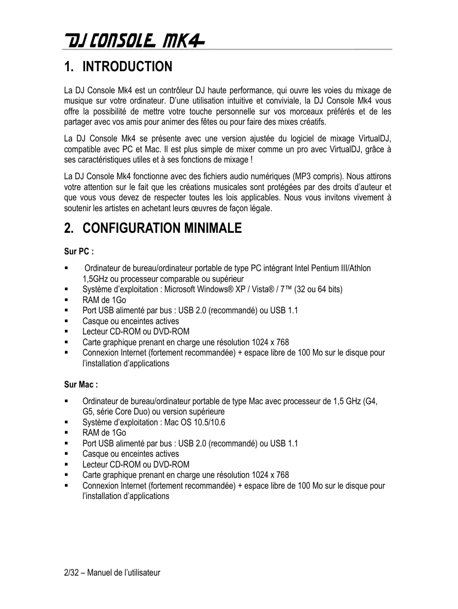 1. INTRODUCTION La DJ Console Mk4 est un contrôleur DJ haute performance, qui ouvre les voies du mixage de musique sur votre ordinateur. D'une utilisation intuitive et conviviale, la DJ Console Mk4 vous offre la possibilité de mettre votre touche personnelle sur vos morceaux préférés et de les partager avec vos amis pour animer des fêtes ou pour faire des mixes créatifs.