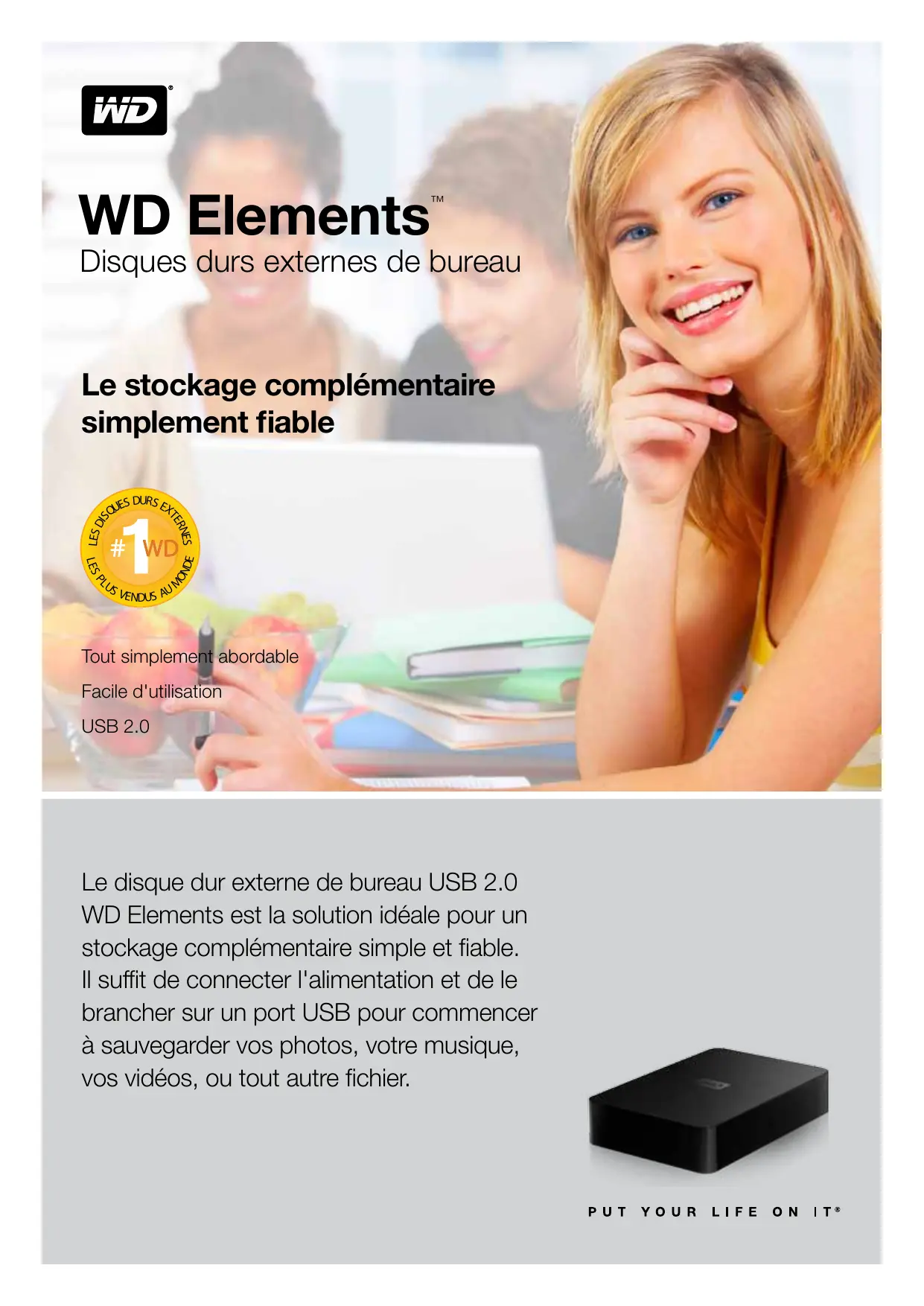 Tout smoima nor ÿ 203 Facile d'utilisation | USB20 1. : = V — L d« ll Le eee 4 Le disque dur externe de bureau USB 2.0 WD Elements est la solution idéale pour un stockage complémentaire simple et fiable. Il suffit de connecter l'alimentation et de le brancher sur un port USB pour commencer à sauvegarder vos photos, votre musique, vos vidéos, ou tout autre fichier.