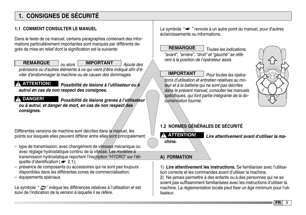 Dans le texte de ce manuel, certains paragraphes contenant des informations particulièrement importantes sont marqués par différents degrés de mise en relief dont la signification est la suivante: REMARQUE IMPORTANT ou alors Ajoute des précisions ou d'autres éléments à ce qui vient d'être indiqué afin d’éviter d’endommager la machine ou de causer des dommages. ATTENTION! Possibilité de lésions à l’utilisateur ou à autrui en cas de non respect des consignes. DANGER! Possibilité de lésions graves à l’utilisateur ou à autrui, et danger de mort, en cas de non respect des consignes. Différentes versions de machine sont décrites dans le manuel, les points sur lesquels elles peuvent différer entre elles sont principalement: – type de transmission: avec changement de vitesses mécanique ou avec réglage hydrostatique continu de la vitesse. Les modèles à transmission hydrostatique reportent l’inscription “HYDRO” sur l’étiquette d’identification ( 2.1); – présence de composants ou accessoires qui ne sont pas toujours disponibles dans les différentes zones de commercialisation; – équipements spéciaux. Le symbole “ ” indique les différences relatives à l’utilisation et est suivi de l’indication de la version à laquelle il se réfère. Le symbole “ ” renvoie à un autre point du manuel, pour d’autres éclaircissements ou informations. REMARQUE Toutes les indications “avant”, “arrière”, “droit” et “gauche” se réfèrent à la position de l’opérateur assis. IMPORTANT Pour toutes les opérations d’utilisation et entretien relatives au moteur et à la batterie qui ne sont pas décrites dans le présent manuel, consulter les manuels spécifiques, qui font partie intégrante de la documentation fournie.