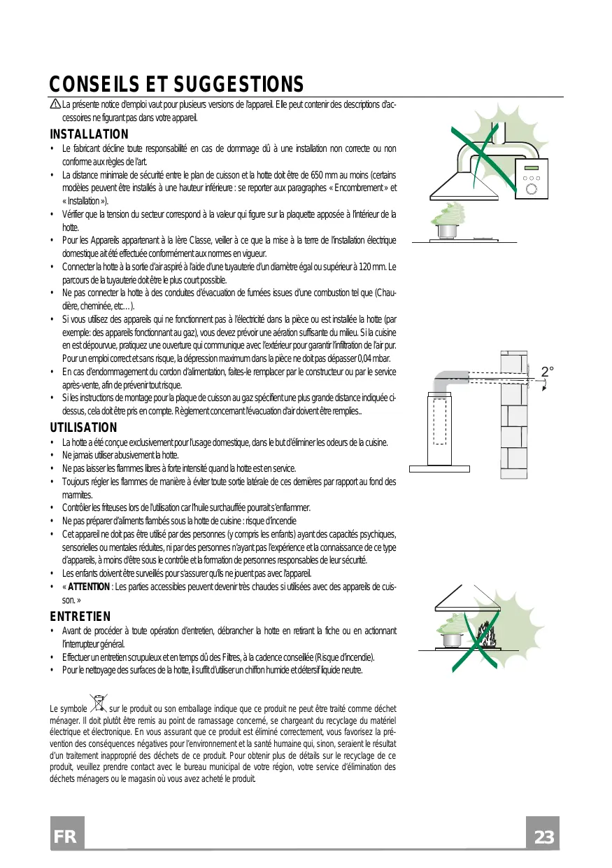 • Pour le nettoyage des surfaces de la hotte, il suffit d’utiliser un chiffon humide et détersif liquide neutre. Le symbole sur le produit ou son emballage indique que ce produit ne peut être traité comme déchet ménager. Il doit plutôt être remis au point de ramassage concerné, se chargeant du recyclage du matériel électrique et électronique. En vous assurant que ce produit est éliminé correctement, vous favorisez la prévention des conséquences négatives pour l’environnement et la santé humaine qui, sinon, seraient le résultat d’un traitement inapproprié des déchets de ce produit. Pour obtenir plus de détails sur le recyclage de ce produit, veuillez prendre contact avec le bureau municipal de votre région, votre service d’élimination des déchets ménagers ou le magasin où vous avez acheté le produit.