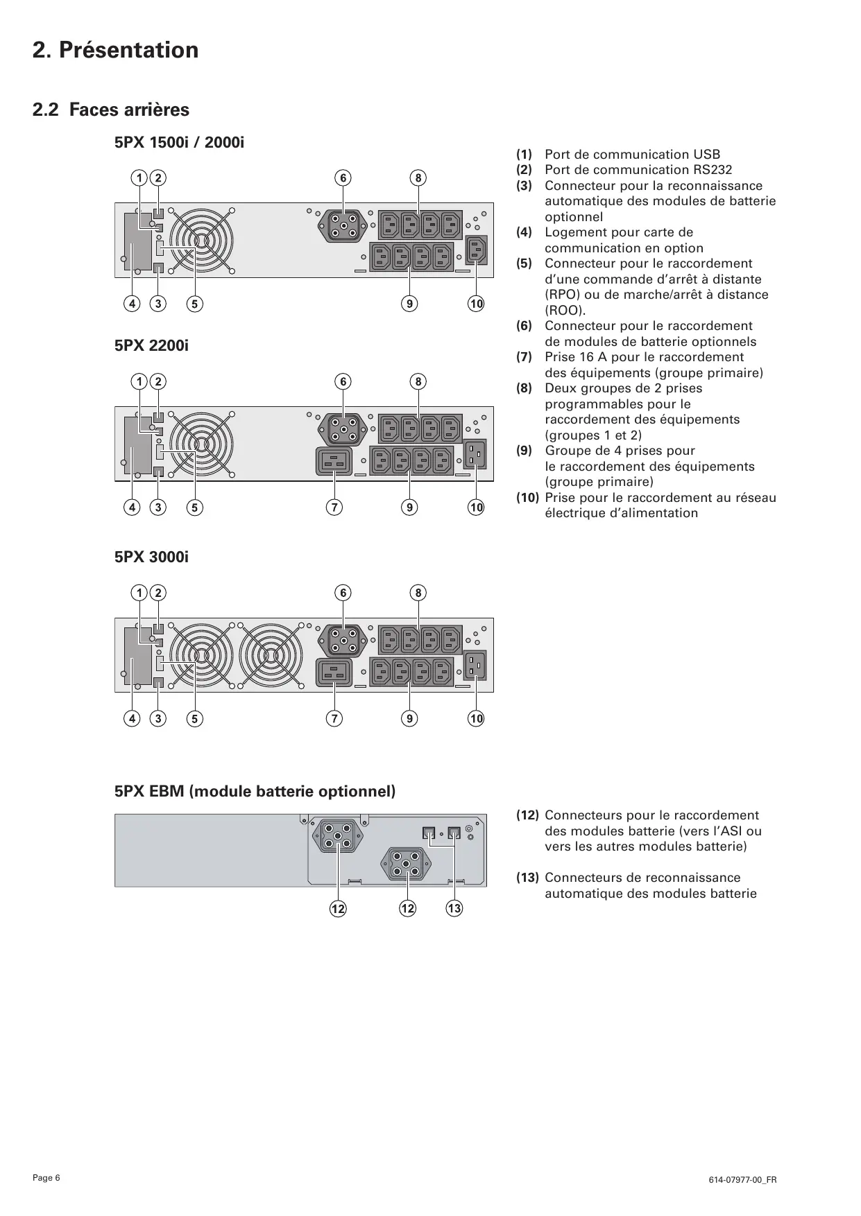 5PX 1500i / 2000i 5PX 2200i (1) Port de communication USB (2) Port de communication RS232 (3) Connecteur pour la reconnaissance automatique des modules de batterie optionnel (4) Logement pour carte de communication en option (5) Connecteur pour le raccordement d’une commande d’arrêt à distante (RPO) ou de marche/arrêt à distance (ROO). (6) Connecteur pour le raccordement de modules de batterie optionnels (7) Prise 16 A pour le raccordement des équipements (groupe primaire) (8) Deux groupes de 2 prises programmables pour le raccordement des équipements (groupes 1 et 2) (9) Groupe de 4 prises pour le raccordement des équipements (groupe primaire) (10) Prise pour le raccordement au réseau électrique d’alimentation 5PX 3000i 5PX EBM (module batterie optionnel) (12) Connecteurs pour le raccordement des modules batterie (vers l’ASI ou vers les autres modules batterie) (13) Connecteurs de reconnaissance automatique des modules batterie Page 6 614-07977-00_FR
