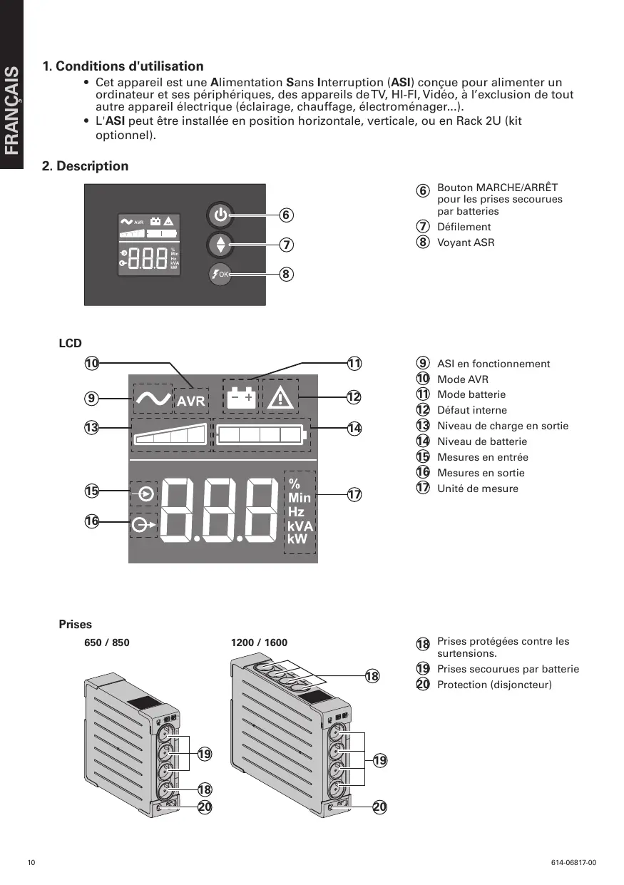 Charge batterie L'ASI charge sa batterie dès qu’elle est connectée au réseau électrique quel que soit l'état du bouton 6 . A la première utilisation, la batterie ne donne sa pleine autonomie qu'après une recharge de 8 heures. Pour conserver la meilleure autonomie, il est conseillé de laisser l'ASI branchée en permanence sur le réseau électrique. Mise en marche de l'ASI Appuyer sur le bouton 6 environ 1 seconde. Prises protégées contre les surtensions 18 non secourues Les appareils raccordés sur ces prises sont alimentés dès que le câble d’entrée 4 est branché sur une prise murale. Le bouton 6 ne les commande pas. Prises secourues 19 Les appareils raccordés sur ces prises sont alimentés dès que le bouton 6 est allumé en vert (voir figure D). Ces prises peuvent être mises en marche même si l'ASI n'est pas connectée au réseau électrique (bouton 6 clignotant).