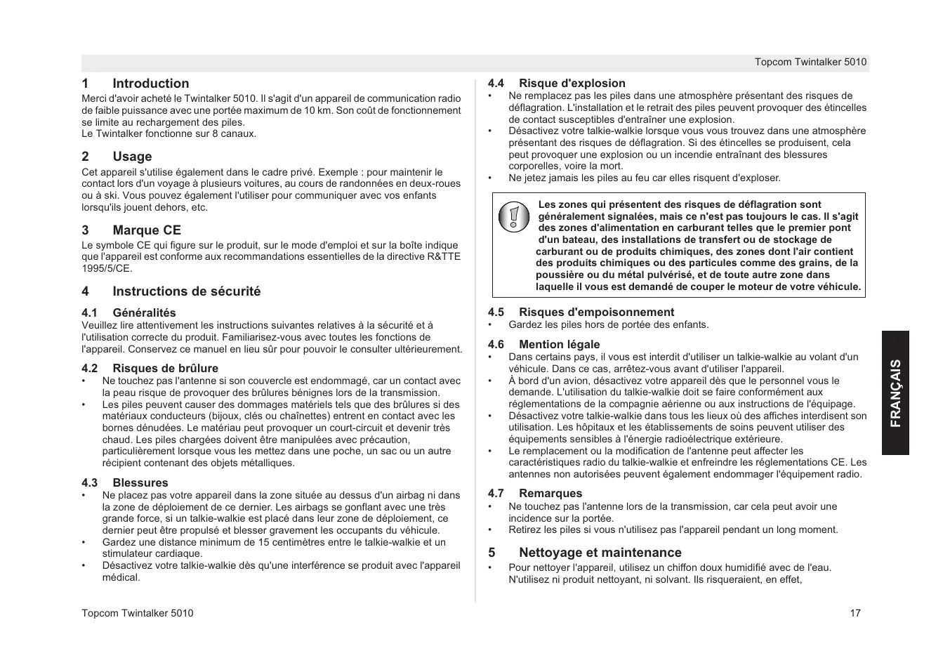 TWINTALKER 5010 - Talkie-walkie TOPCOM - Notice d'utilisation et mode d'emploi gratuit