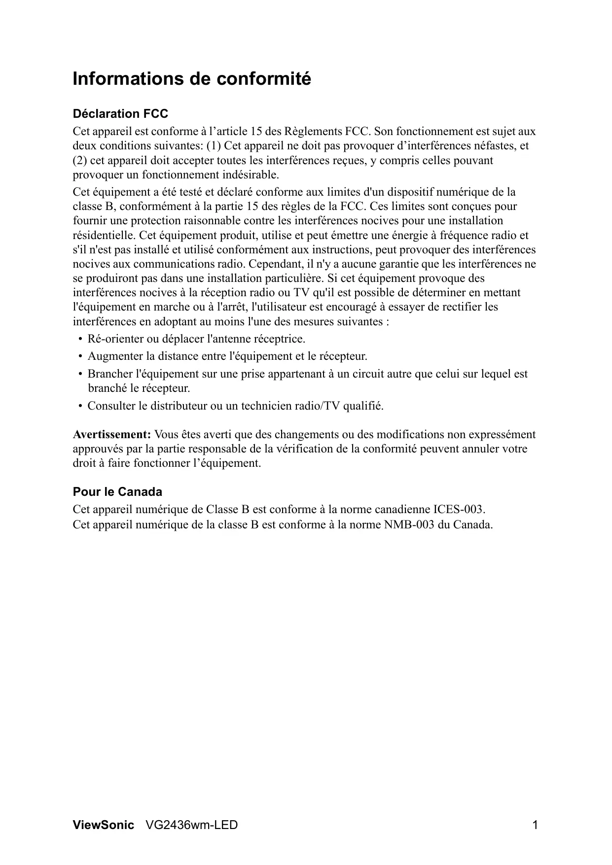 - Garantie limitée ViewSonic VG2436wm-LED Informations de conformité Déclaration FCC Cet appareil est conforme à l’article 15 des Règlements FCC. Son fonctionnement est sujet aux deux conditions suivantes: (1) Cet appareil ne doit pas provoquer d’interférences néfastes, et (2) cet appareil doit accepter toutes les interférences reçues, y compris celles pouvant provoquer un fonctionnement indésirable. Cet équipement a été testé et déclaré conforme aux limites d'un dispositif numérique de la classe B, conformément à la partie 15 des règles de la FCC. Ces limites sont conçues pour fournir une protection raisonnable contre les interférences nocives pour une installation résidentielle. Cet équipement produit, utilise et peut émettre une énergie à fréquence radio et s'il n'est pas installé et utilisé conformément aux instructions, peut provoquer des interférences nocives aux communications radio. Cependant, il n'y a aucune garantie que les interférences ne se produiront pas dans une installation particulière. Si cet équipement provoque des interférences nocives à la réception radio ou TV qu'il est possible de déterminer en mettant l'équipement en marche ou à l'arrêt, l'utilisateur est encouragé à essayer de rectifier les interférences en adoptant au moins l'une des mesures suivantes : p. 19
