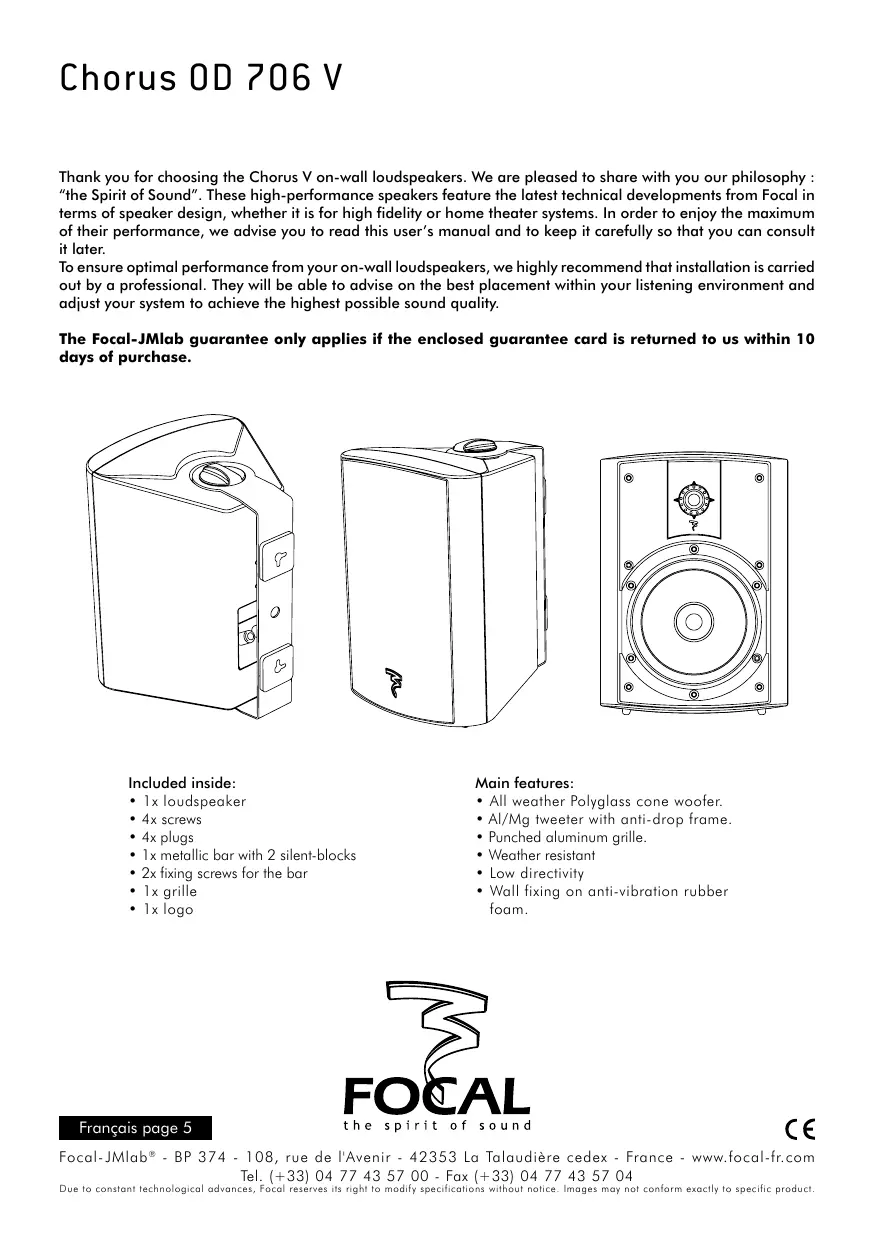 Nous vous remercions d'avoir choisi les enceintes murales de la ligne Chorus V et de partager avec nous notre philosophie "The Spirit of Sound". Ces enceintes de haute technicité intègrent les ultimes perfectionnements Focal en matière de conception de haut-parleurs pour la haute-fidélité et le home cinema.