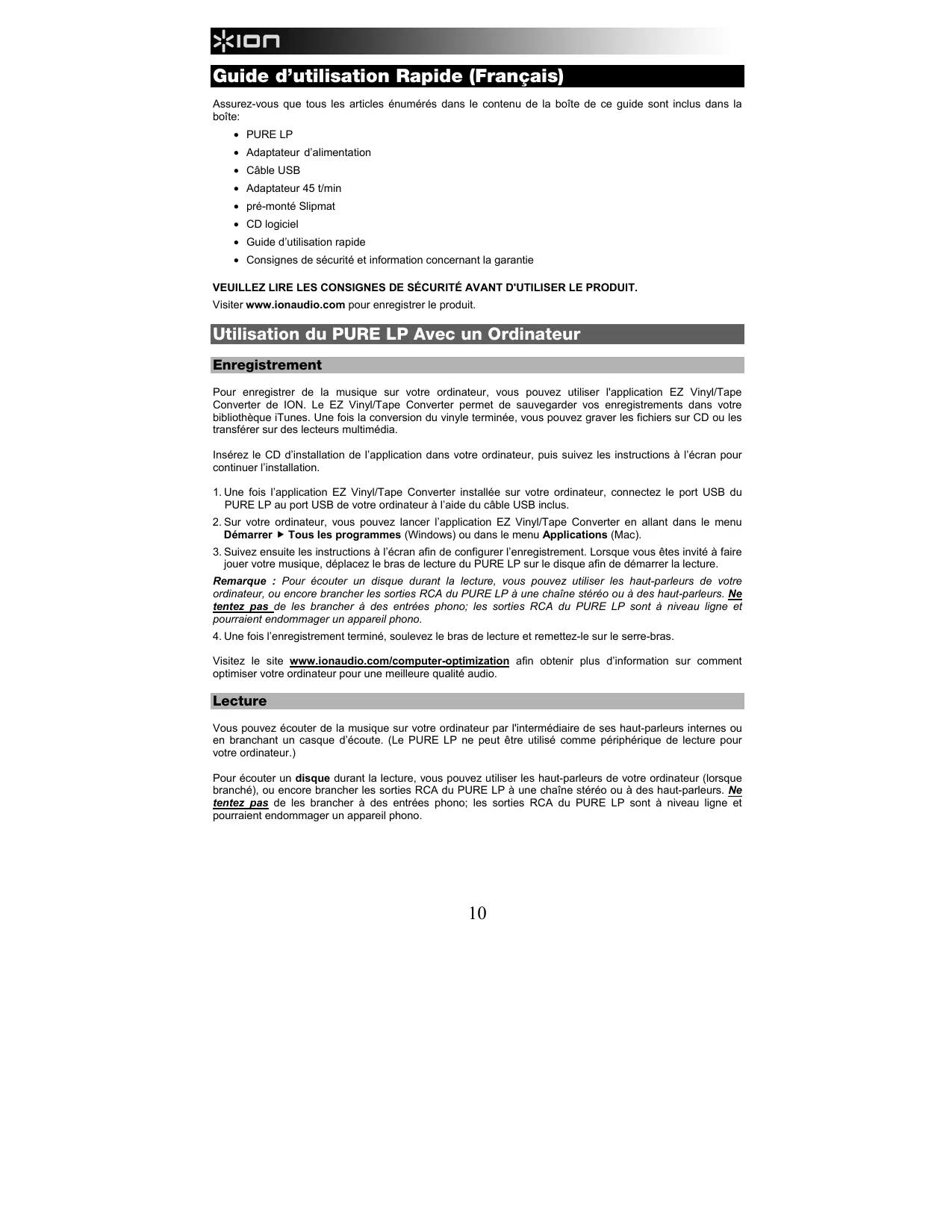 • Consignes de sécurité et information concernant la garantie VEUILLEZ LIRE LES CONSIGNES DE SÉCURITÉ AVANT D'UTILISER LE PRODUIT. Visiter www.ionaudio.com pour enregistrer le produit. Utilisation du PURE LP Avec un Ordinateur Enregistrement Pour enregistrer de la musique sur votre ordinateur, vous pouvez utiliser l'application EZ Vinyl/Tape Converter de ION. Le EZ Vinyl/Tape Converter permet de sauvegarder vos enregistrements dans votre bibliothèque iTunes. Une fois la conversion du vinyle terminée, vous pouvez graver les fichiers sur CD ou les transférer sur des lecteurs multimédia. Insérez le CD d’installation de l’application dans votre ordinateur, puis suivez les instructions à l’écran pour continuer l’installation.