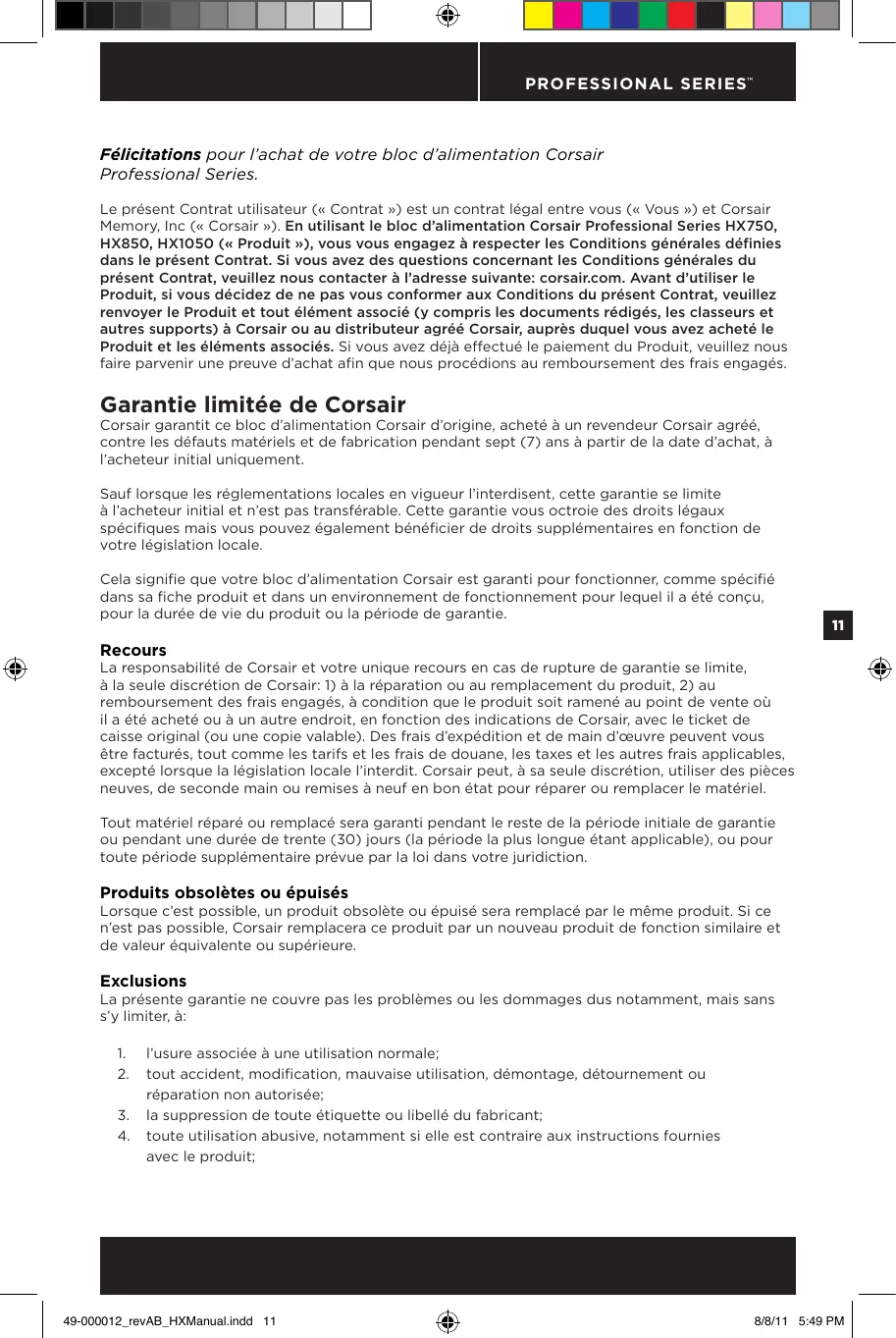 R 51318.22-99 R 51318.24-99 R 51317.3.2-2006 R 51317.3.3-99 2002/95/EC, Restriction of Hazardous Substances Directive 2002/96/EC, Waste Electrical and Electronic Equipment Directive China Order No.39, Administration on the Control of Pollution Caused By Electronic Information Products 49-000012_revAB_HXManual.indd 10 8/8/11 5:49 PM PROFESSIONAL SERIES ™ Félicitations pour l’achat de votre bloc d’alimentation Corsair Professional Series. Le présent Contrat utilisateur (« Contrat ») est un contrat légal entre vous (« Vous ») et Corsair Memory, Inc (« Corsair »). En utilisant le bloc d’alimentation Corsair Professional Series HX750, HX850, HX1050 (« Produit »), vous vous engagez à respecter les Conditions générales définies dans le présent Contrat. Si vous avez des questions concernant les Conditions générales du présent Contrat, veuillez nous contacter à l’adresse suivante: corsair.com. Avant d’utiliser le Produit, si vous décidez de ne pas vous conformer aux Conditions du présent Contrat, veuillez renvoyer le Produit et tout élément associé (y compris les documents rédigés, les classeurs et autres supports) à Corsair ou au distributeur agréé Corsair, auprès duquel vous avez acheté le Produit et les éléments associés. Si vous avez déjà effectué le paiement du Produit, veuillez nous faire parvenir une preuve d’achat afin que nous procédions au remboursement des frais engagés. Garantie limitée de Corsair Corsair garantit ce bloc d’alimentation Corsair d’origine, acheté à un revendeur Corsair agréé, contre les défauts matériels et de fabrication pendant sept (7) ans à partir de la date d’achat, à l’acheteur initial uniquement. Sauf lorsque les réglementations locales en vigueur l’interdisent, cette garantie se limite à l’acheteur initial et n’est pas transférable. Cette garantie vous octroie des droits légaux spécifiques mais vous pouvez également bénéficier de droits supplémentaires en fonction de votre législation locale. Cela signifie que votre bloc d’alimentation Corsair est garanti pour fonctionner, comme spécifié dans sa fiche produit et dans un environnement de fonctionnement pour lequel il a été conçu, pour la durée de vie du produit ou la période de garantie.