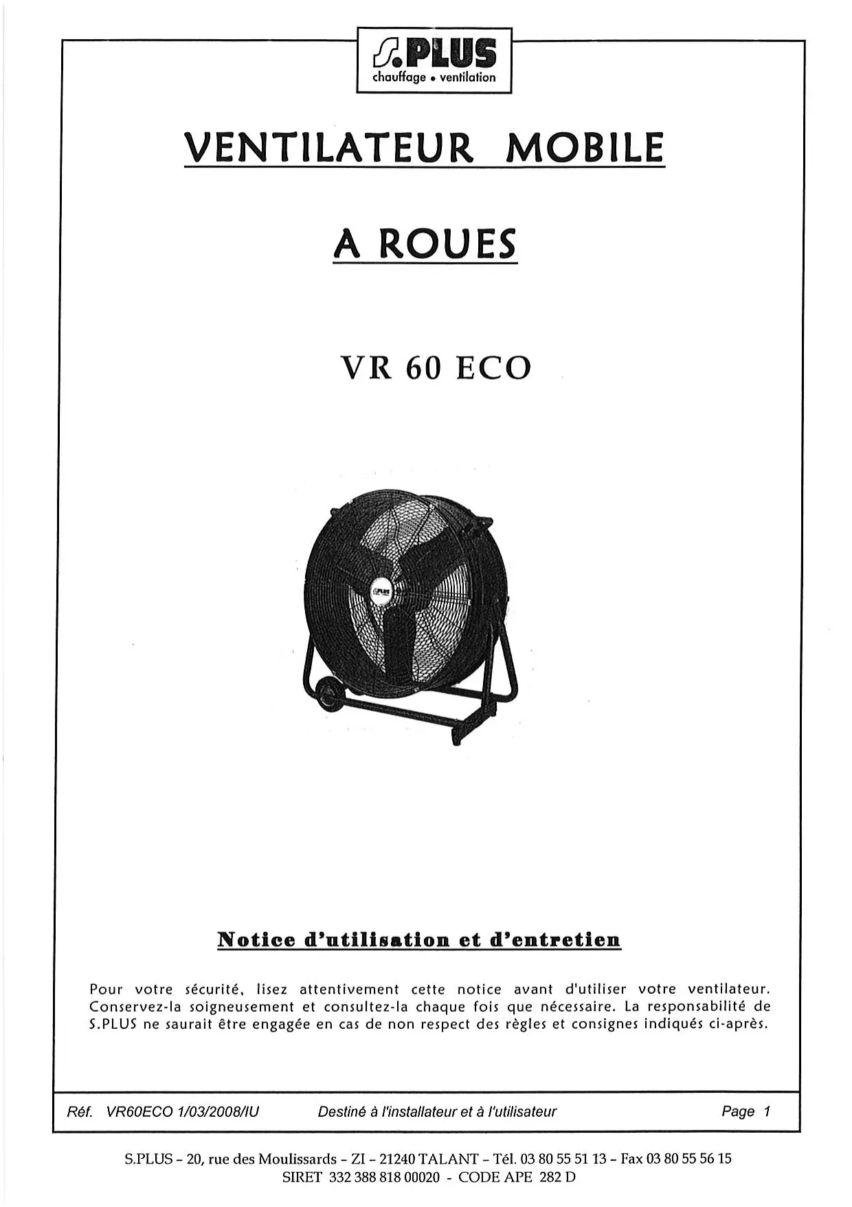 VR 60 ECO - Ventilateur S.PLUS - Notice d'utilisation et mode d'emploi gratuit