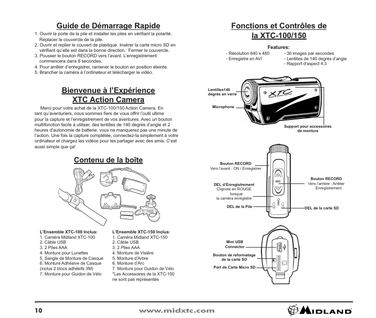 Merci pour votre achat de la XTC-100/150 Action Camera. En tant qu’aventuriers, nous sommes fiers de vous offrir l’outil ultime pour la capture et l’enregistrement de vos aventures. Avec un bouton multifonction facile à utiliser, des lentilles de 140 degrés d’angle et 2 heures d’autonomie de batterie, vous ne manquerez pas une minute de l’action. Une fois la capture complétée, connectez-la simplement à votre ordinateur et chargez les vidéos pour les partager avec des amis. C’est aussi simple que ça!