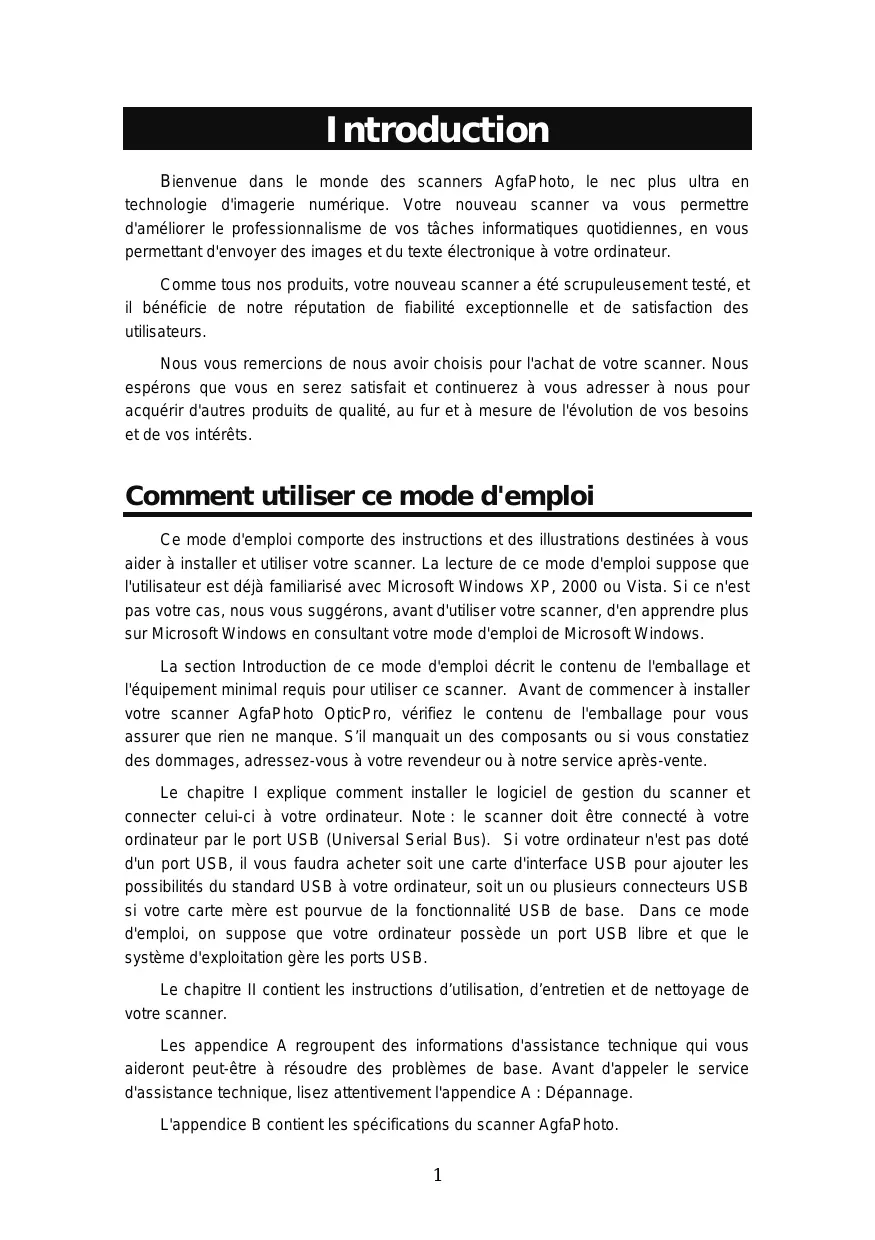 Introduction Bienvenue dans le monde des scanners AgfaPhoto, le nec plus ultra en technologie d'imagerie numérique. Votre nouveau scanner va vous permettre d'améliorer le professionnalisme de vos tâches informatiques quotidiennes, en vous permettant d'envoyer des images et du texte électronique à votre ordinateur. Comme tous nos produits, votre nouveau scanner a été scrupuleusement testé, et il bénéficie de notre réputation de fiabilité exceptionnelle et de satisfaction des utilisateurs. Nous vous remercions de nous avoir choisis pour l'achat de votre scanner. Nous espérons que vous en serez satisfait et continuerez à vous adresser à nous pour acquérir d'autres produits de qualité, au fur et à mesure de l'évolution de vos besoins et de vos intérêts. Comment utiliser ce mode d'emploi Ce mode d'emploi comporte des instructions et des illustrations destinées à vous aider à installer et utiliser votre scanner. La lecture de ce mode d'emploi suppose que l'utilisateur est déjà familiarisé avec Microsoft Windows XP, 2000 ou Vista. Si ce n'est pas votre cas, nous vous suggérons, avant d'utiliser votre scanner, d'en apprendre plus sur Microsoft Windows en consultant votre mode d'emploi de Microsoft Windows. La section Introduction de ce mode d'emploi décrit le contenu de l'emballage et l'équipement minimal requis pour utiliser ce scanner. Avant de commencer à installer votre scanner AgfaPhoto OpticPro, vérifiez le contenu de l'emballage pour vous assurer que rien ne manque. S’il manquait un des composants ou si vous constatiez des dommages, adressez-vous à votre revendeur ou à notre service après-vente. Le chapitre I explique comment installer le logiciel de gestion du scanner et connecter celui-ci à votre ordinateur. Note : le scanner doit être connecté à votre ordinateur par le port USB (Universal Serial Bus). Si votre ordinateur n'est pas doté d'un port USB, il vous faudra acheter soit une carte d'interface USB pour ajouter les possibilités du standard USB à votre ordinateur, soit un ou plusieurs connecteurs USB si votre carte mère est pourvue de la fonctionnalité USB de base. Dans ce mode d'emploi, on suppose que votre ordinateur possède un port USB libre et que le système d'exploitation gère les ports USB. Le chapitre II contient les instructions d’utilisation, d’entretien et de nettoyage de votre scanner. Les appendice A regroupent des informations d'assistance technique qui vous aideront peut-être à résoudre des problèmes de base. Avant d'appeler le service d'assistance technique, lisez attentivement l'appendice A : Dépannage. L'appendice B contient les spécifications du scanner AgfaPhoto.