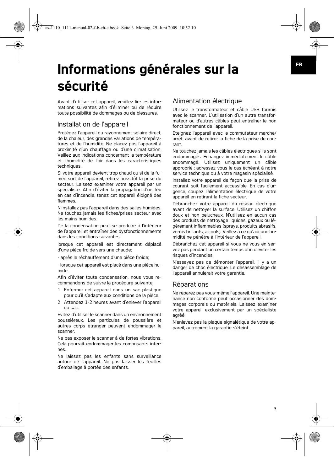 Informations générales sur la sécurité Informations générales sur la sécurité Avant d’utiliser cet appareil, veuillez lire les informations suivantes afin d’éliminer ou de réduire toute possibilité de dommages ou de blessures. Installation de l’appareil Protégez l’appareil du rayonnement solaire direct Protégez l’appareil du rayonnement solaire direct, de la chaleur, des grandes variations de températures et de l’humidité. Ne placez pas l’appareil à proximité d’un chauffage ou d’une climatisation. Veillez aux indications concernant la température et l’humidité de l’air dans les caractéristiques techniques. Si votre appareil devient trop chaud ou si de la fumée sort de l’appareil Si votre appareil devient trop chaud ou si de la fumée sort de l’appareil, retirez aussitôt la prise du secteur. Laissez examiner votre appareil par un spécialiste. Afin d’éviter la propagation d’un feu en cas d’incendie, tenez cet appareil éloigné des flammes. N’installez pas l’appareil dans des salles humides. N’installez pas l’appareil dans des salles humides. Ne touchez jamais les fiches/prises secteur avec les mains humides. Condensation De la condensation peut se produire à l’intérieur de l’appareil et entraîner des dysfonctionnements dans les conditions suivantes: Alimentation électrique Utilisez le transformateur et câble USB fournis avec le scanner. Utilisez le transformateur et câble USB fournis avec le scanner. L’utilisation d’un autre transformateur ou d’autres câbles peut entraîner le non fonctionnement de l’appareil. Généralités sur le commutateur marche/arrêt Eteignez l’appareil avec le commutateur marche/ arrêt, avant de retirer la fiche de la prise de courant. Ne touchez jamais les câbles électriques s’ils sont endommagés. Ne touchez jamais les câbles électriques s’ils sont endommagés. Echangez immédiatement le câble endommagé. Utilisez uniquement un câble approprié ; adressez-vous le cas échéant à notre service technique ou à votre magasin spécialisé. Installez votre appareil de façon que la prise de courant soit facilement accessible. Installez votre appareil de façon que la prise de courant soit facilement accessible. En cas d’urgence, coupez l’alimentation électrique de votre appareil en retirant la fiche secteur. Débranchez votre appareil du réseau électrique avant de nettoyer la surface. Débranchez votre appareil du réseau électrique avant de nettoyer la surface. Utilisez un chiffon doux et non pelucheux. N’utilisez en aucun cas des produits de nettoyage liquides, gazeux ou légèrement inflammables (sprays, produits abrasifs, vernis brillants, alcools). Veillez à ce qu’aucune humidité ne pénètre à l’intérieur de l’appareil. Débranchez cet appareil si vous ne vous en servez pas pendant un certain temps afin d’éviter les risques d’incendies. lorsque cet appareil est directement déplacé d’une pièce froide vers une chaude;