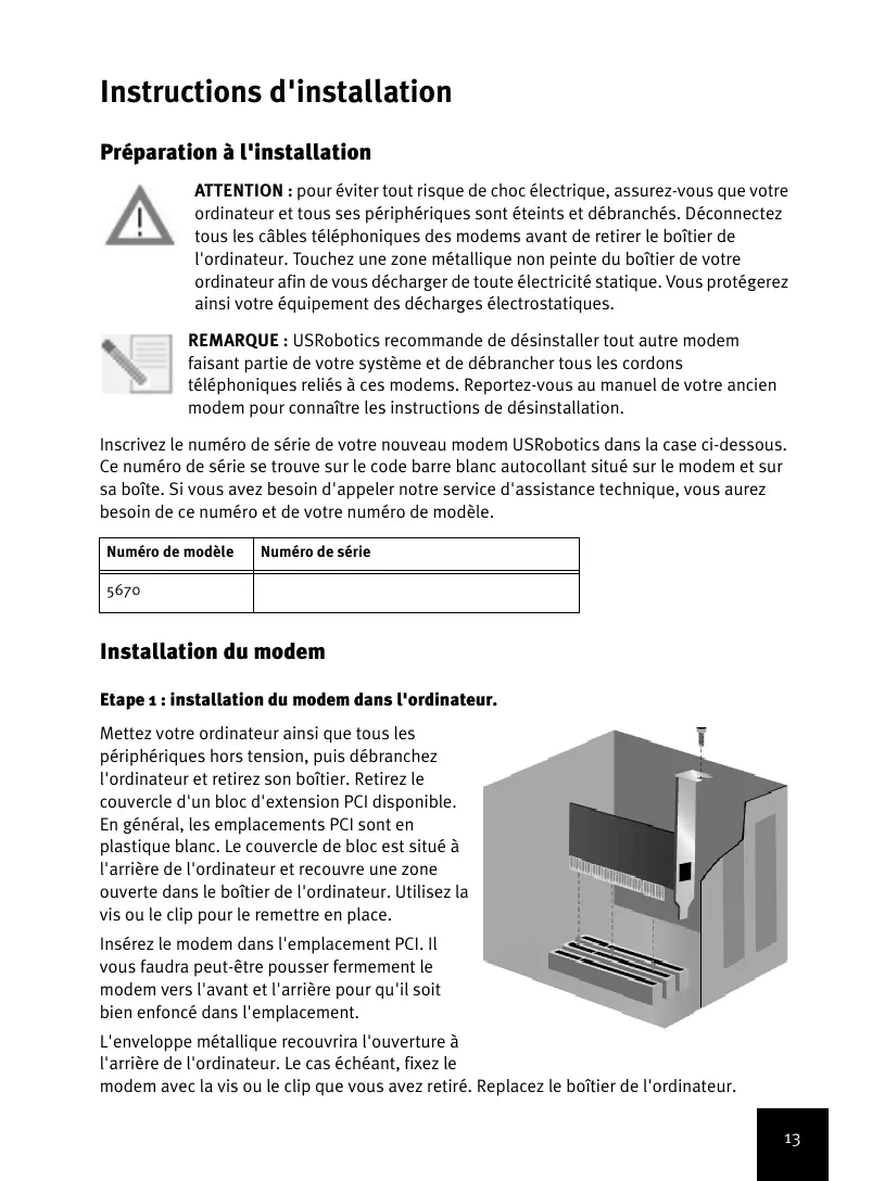 MODE D'EMPLOI 56K PCI FAXMODEM V92 US ROBOTICS