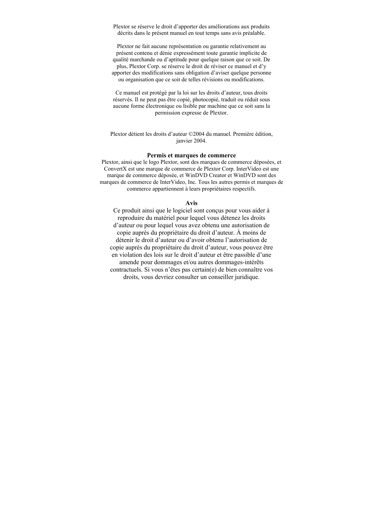 JANVIER 2004 Plextor se réserve le droit d’apporter des améliorations aux produits décrits dans le présent manuel en tout temps sans avis préalable. Plextor ne fait aucune représentation ou garantie relativement au présent contenu et dénie expressément toute garantie implicite de qualité marchande ou d’aptitude pour quelque raison que ce soit. De plus, Plextor Corp. se réserve le droit de réviser ce manuel et d’y apporter des modifications sans obligation d’aviser quelque personne ou organisation que ce soit de telles révisions ou modifications. Ce manuel est protégé par la loi sur les droits d’auteur, tous droits réservés. Il ne peut pas être copié, photocopié, traduit ou réduit sous aucune forme électronique ou lisible par machine que ce soit sans la permission expresse de Plextor. Plextor détient les droits d’auteur ©2004 du manuel. Première édition, janvier 2004. Permis et marques de commerce Plextor, ainsi que le logo Plextor, sont des marques de commerce déposées, et ConvertX est une marque de commerce de Plextor Corp. InterVideo est une marque de commerce déposée, et WinDVD Creator et WinDVD sont des marques de commerce de InterVideo, Inc. Tous les autres permis et marques de commerce appartiennent à leurs propriétaires respectifs. Avis Ce produit ainsi que le logiciel sont conçus pour vous aider à reproduire du matériel pour lequel vous détenez les droits d’auteur ou pour lequel vous avez obtenu une autorisation de copie auprès du propriétaire du droit d’auteur. À moins de détenir le droit d’auteur ou d’avoir obtenu l’autorisation de copie auprès du propriétaire du droit d’auteur, vous pouvez être en violation des lois sur le droit d’auteur et être passible d’une amende pour dommages et/ou autres dommages-intérêts contractuels. Si vous n’êtes pas certain(e) de bien connaître vos droits, vous devriez consulter un conseiller juridique.