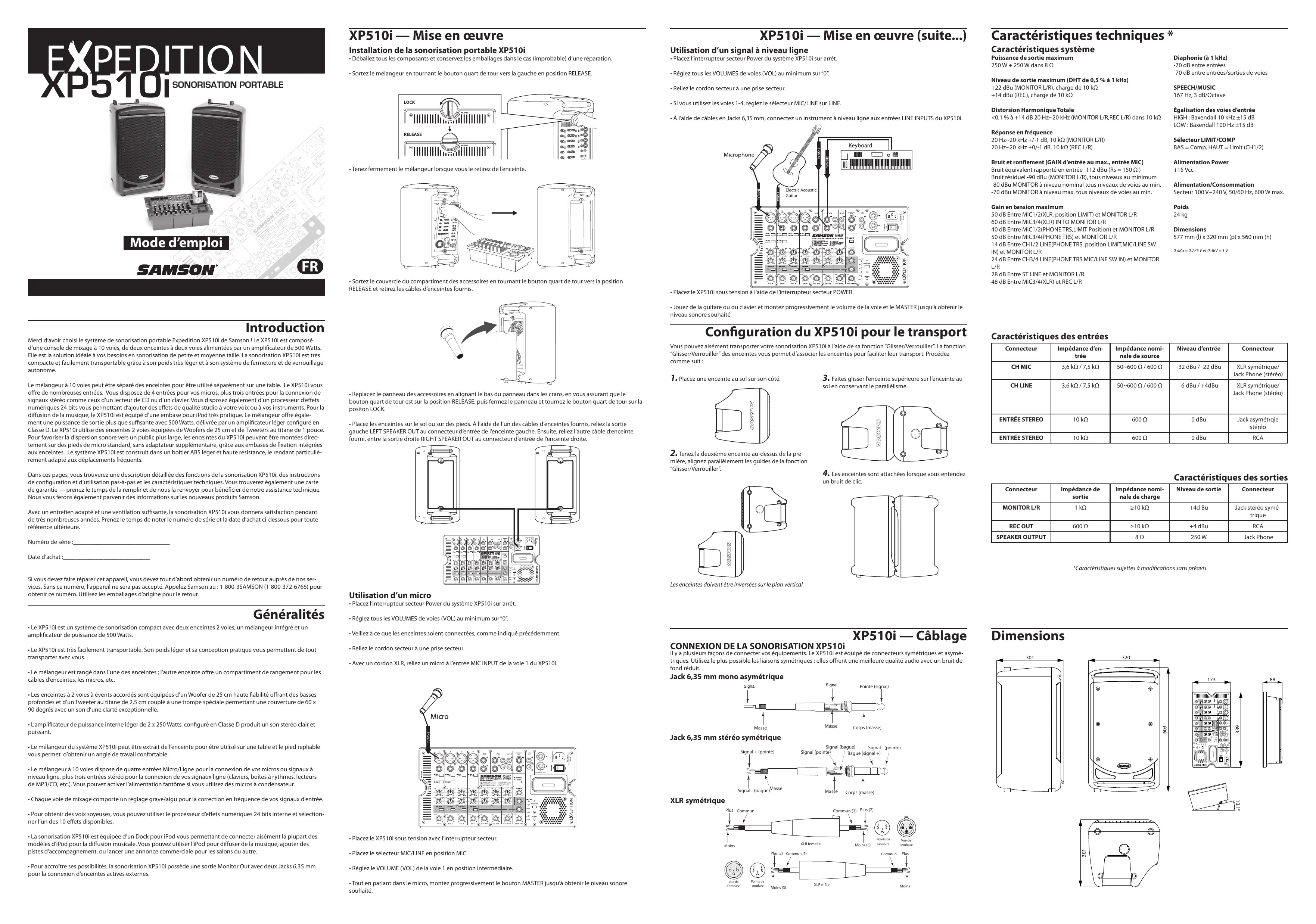 Merci d'avoir choisi le système de sonorisation portable Expedition XP510i de Samson! Le XP510i est composé d'une console de mixage à 10 voies, de deux enceintes à deux voies alimentées par un amplificateur de 500 Watts. Elle est la solution ideale à vos besoin en sonorisation de petite et moyenne taille. La sonorisation XP510i est très compacte et facilement transportable grâce à sonroids très léger et à son système de fermeture et de verrouillage autonome.