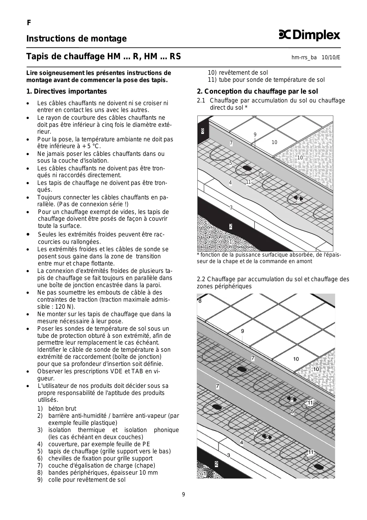Les câbles chauffants ne doivent ni se croiser ni entrer en contact les uns avec les autres. Le rayon de courbure des câbles chauffants ne doit pas être inférieur à cinq fois le diamètre extérieur. Pour la pose, la température ambiante ne doit pas être inférieure à + 5 °C. Ne jamais poser les câbles chauffants dans ou sous la couche d'isolation. Les câbles chauffants ne doivent pas être tronqués ni raccordés directement. Les tapis de chauffage ne doivent pas être tronqués. Toujours connecter les câbles chauffants en parallèle. (Pas de connexion série !) Pour un chauffage exempt de vides, les tapis de chauffage doivent être posés de façon à couvrir toute la surface. Seules les extrémités froides peuvent être raccourcies ou rallongées. Les extrémités froides et les câbles de sonde se posent sous gaine dans la zone de transition entre mur et chape flottante. La connexion d’extrémités froides de plusieurs tapis de chauffage se fait toujours en parallèle dans une boîte de jonction encastrée dans la paroi. Ne pas soumettre les embouts de câble à des contraintes de traction (traction maximale admissible : 120 N). Ne monter sur les tapis de chauffage que dans la mesure nécessaire à leur pose. Poser les sondes de température de sol sous un tube de protection obturé à son extrémité, afin de permettre leur remplacement le cas échéant. Identifier le câble de sonde de température à son extrémité de raccordement (boîte de jonction) pour que sa profondeur d'insertion soit définie. Observer les prescriptions VDE et TAB en vigueur. L'utilisateur de nos produits doit décider sous sa propre responsabilité de l'aptitude des produits utilisés. 1) béton brut 2) barrière anti-humidité / barrière anti-vapeur (par exemple feuille plastique) 3) isolation thermique et isolation phonique (les cas échéant en deux couches) 4) couverture, par exemple feuille de PE 5) tapis de chauffage (grille support vers le bas) 6) chevilles de fixation pour grille support 7) couche d'égalisation de charge (chape) 8) bandes périphériques, épaisseur 10 mm 9) colle pour revêtement de sol