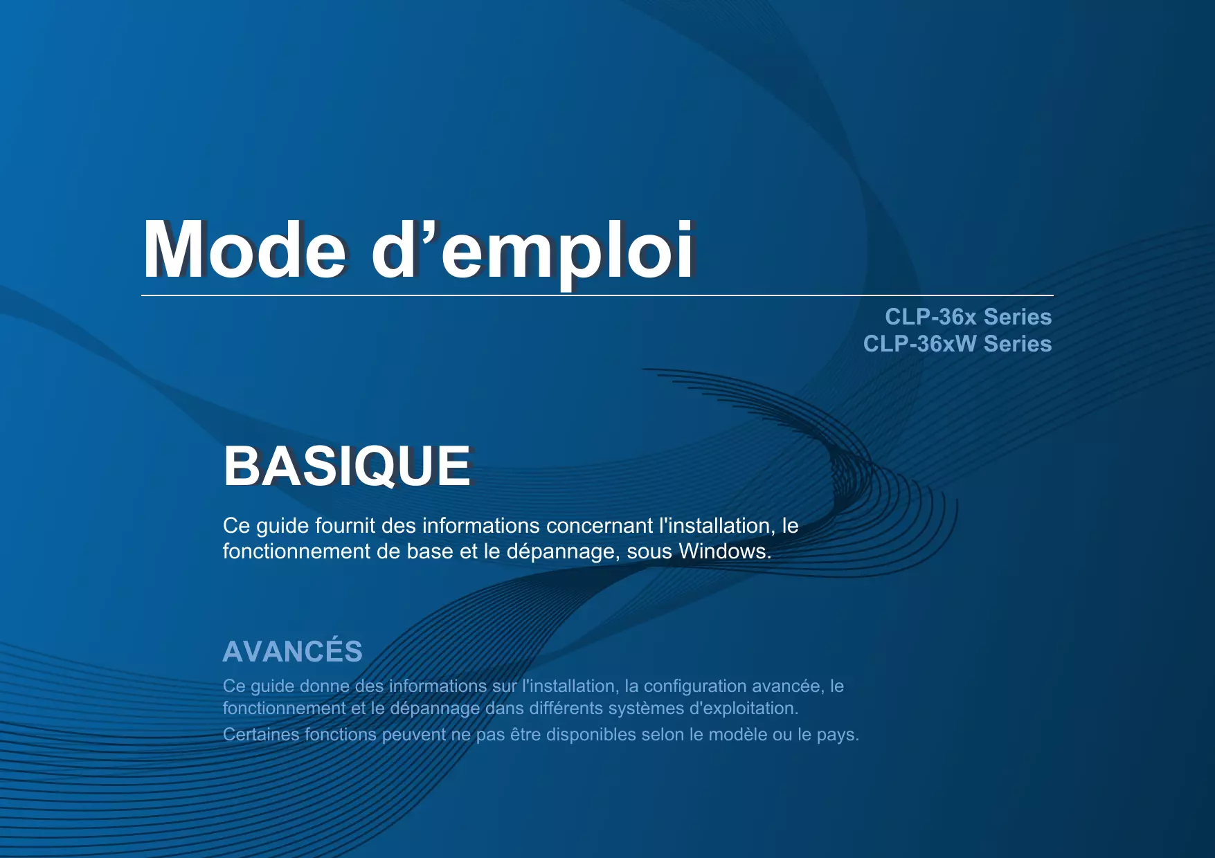 Mode d’emploi CLP-36x Series CLP-36xW Series BASIQUE BASIQUE Ce guide fournit des informations concernant l'installation, le fonctionnement de base et le dépannage, sous Windows. AVANCÉS Ce guide donne des informations sur l'installation, la configuration avancée, le fonctionnement et le dépannage dans différents systèmes d'exploitation. Certaines fonctions peuvent ne pas être disponibles selon le modèle ou le pays. BASIQUE