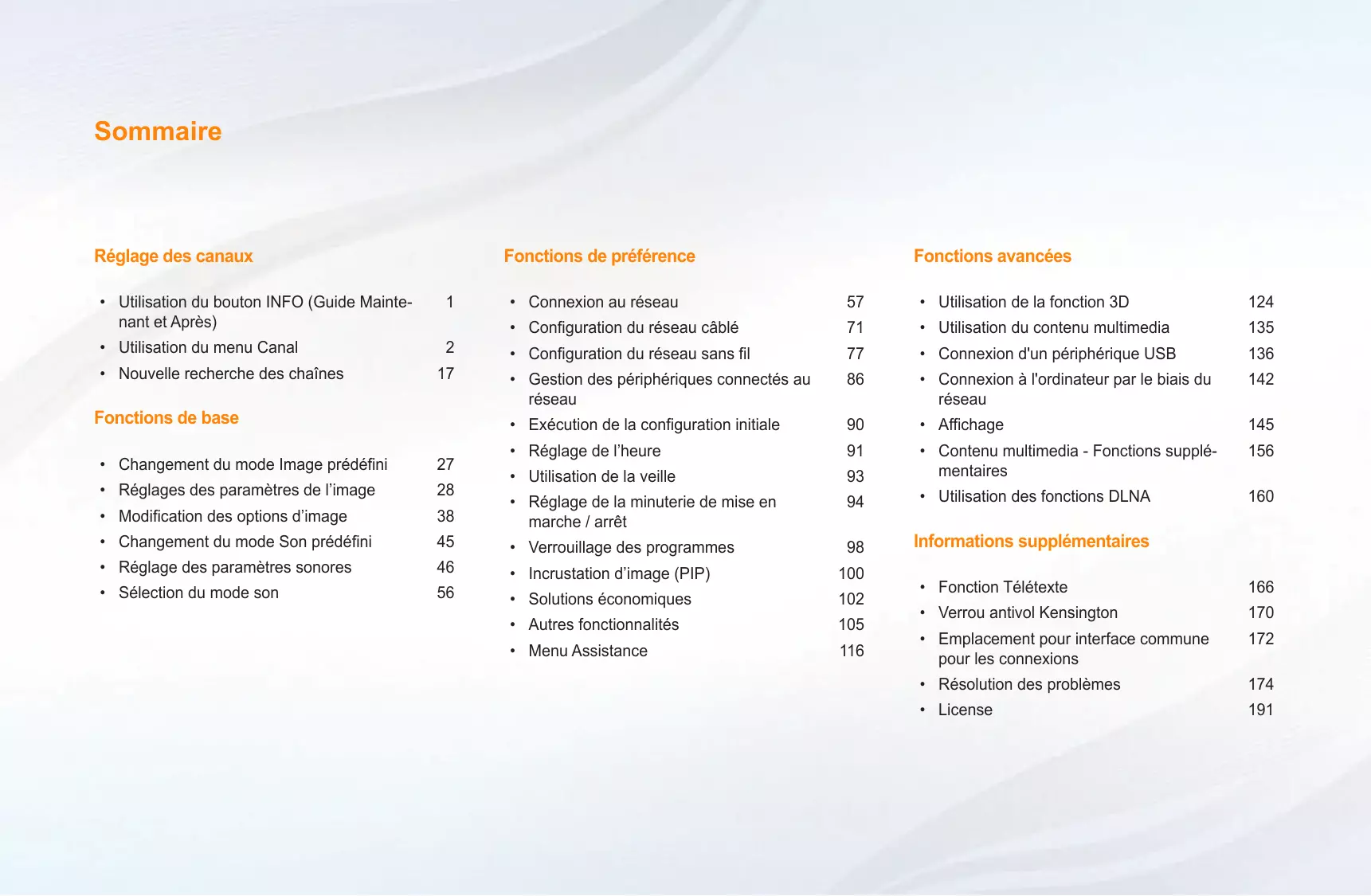 Problèmes Solutions et explications Connexion RF (câble / antenne) Le téléviseur ne reçoit pas toutes les chaînes. ●● Vérifiez que le câble de l'antenne est raccordé correctement. ●● Essayez la fonction Configuration (configuration initiale) pour ajouter des chaînes disponibles à la liste. Accédez à MENU - Système Configuration (configuration initiale) et attendez que toutes les chaînes disponibles soient mémorisées. ●● Vérifiez que l'antenne est positionnée correctement.