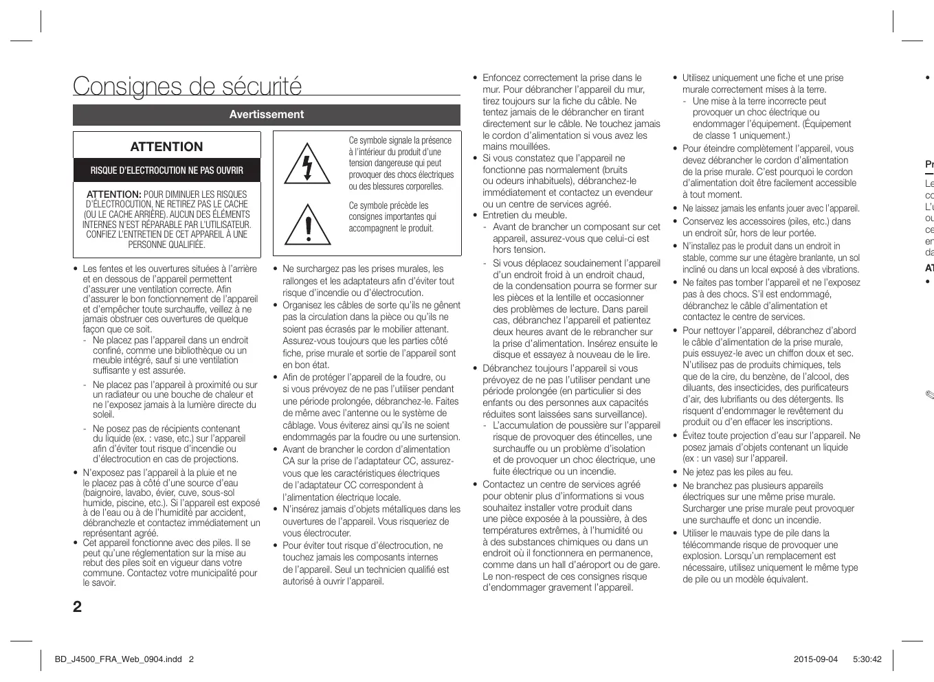 NOTICE BD-J4500 Lecteur de disque Blu-ray™ manuel d’utilisation imaginez les possibilités Nous vous remercions d’avoir choisi ce produit Samsung. Pour avoir accès à d’avantage de services, veuillez enregistrer votre produit sur le site www.samsung.com/register FRANÇAIS BD_J4500_FRA_Web_0904.indd 1 2015-09-04 5:29:49 Consignes de sécurité Avertissement ATTENTION