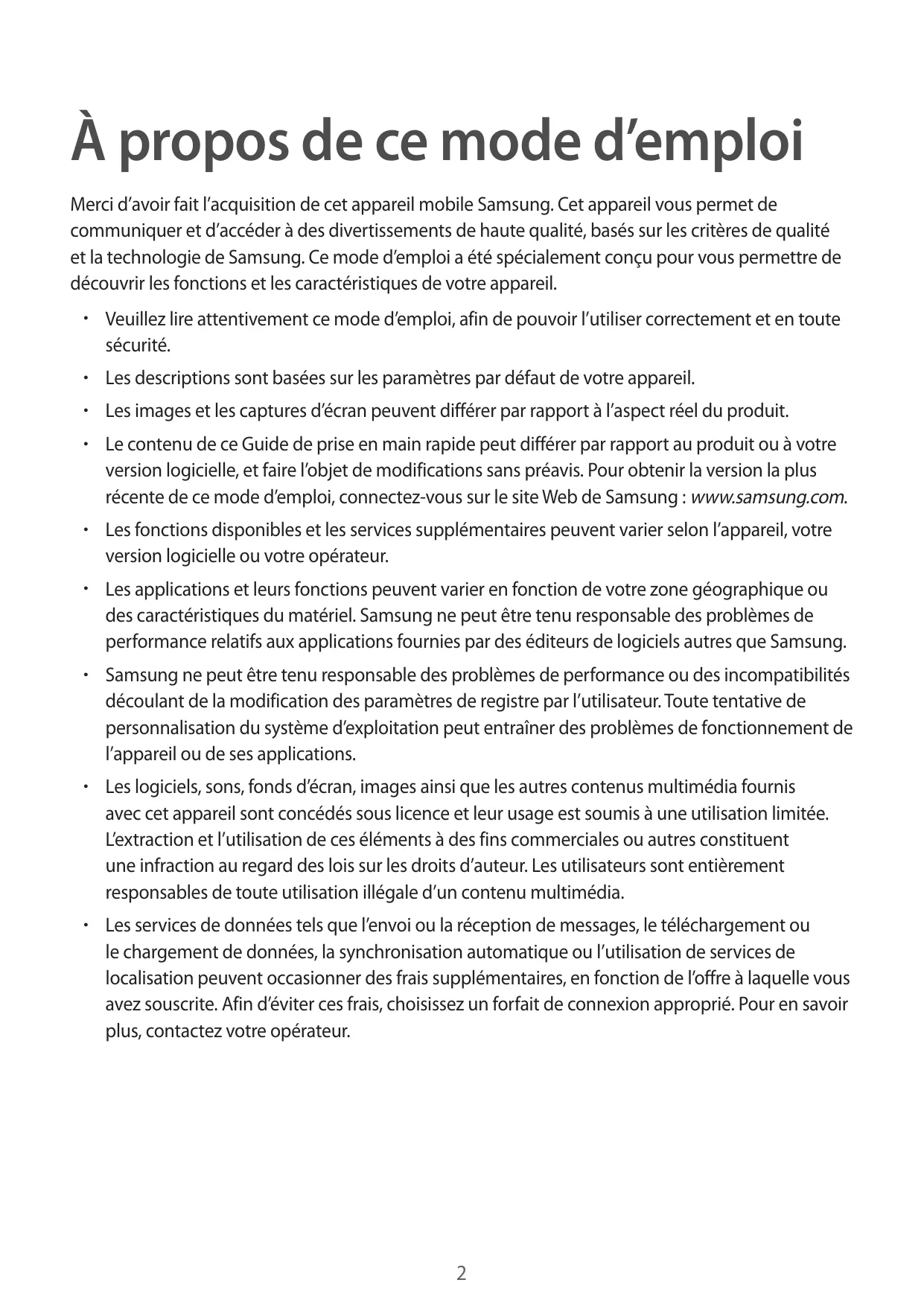 - Les services de données tels que l’envoi ou la réception de messages, le téléchargement ou le chargement de données, la synchronisation automatique ou l’utilisation de services de localisation peuvent occasionner des frais supplémentaires, en fonction de l’offre à laquelle vous avez souscrite. Afin d’éviter ces frais, choisissez un forfait de connexion approprié. Pour en savoir plus, contactez votre opérateur.