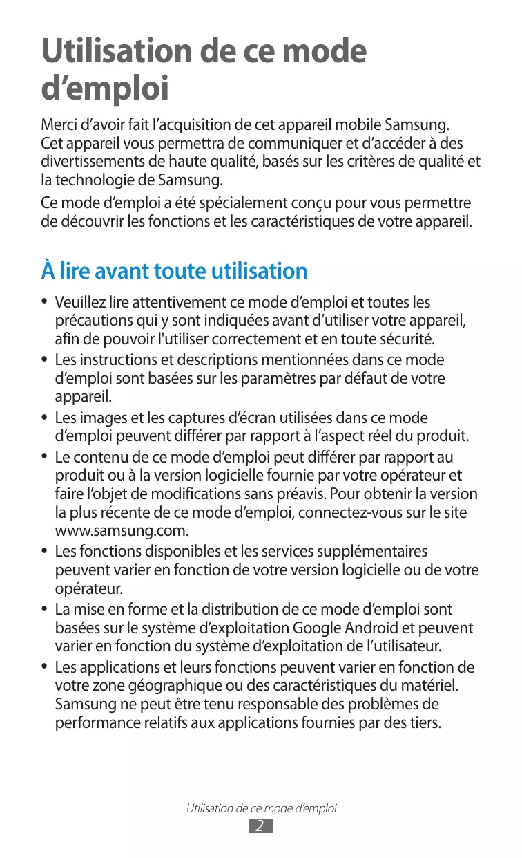 N7000 Mode d’emploi Utilisation de ce mode d’emploi Merci d’avoir fait l’acquisition de cet appareil mobile Samsung. Cet appareil vous permettra de communiquer et d’accéder à des divertissements de haute qualité, basés sur les critères de qualité et la technologie de Samsung. Ce mode d’emploi a été spécialement conçu pour vous permettre de découvrir les fonctions et les caractéristiques de votre appareil. À lire avant toute utilisation Veuillez lire attentivement ce mode d’emploi et toutes les précautions qui y sont indiquées avant d’utiliser votre appareil, afin de pouvoir l'utiliser correctement et en toute sécurité. ●● Les instructions et descriptions mentionnées dans ce mode d’emploi sont basées sur les paramètres par défaut de votre appareil. ●● Les images et les captures d’écran utilisées dans ce mode d’emploi peuvent différer par rapport à l’aspect réel du produit. ●● Le contenu de ce mode d’emploi peut différer par rapport au produit ou à la version logicielle fournie par votre opérateur et faire l’objet de modifications sans préavis. Pour obtenir la version la plus récente de ce mode d’emploi, connectez-vous sur le site www.samsung.com. ●● Les fonctions disponibles et les services supplémentaires peuvent varier en fonction de votre version logicielle ou de votre opérateur. ●● La mise en forme et la distribution de ce mode d’emploi sont basées sur le système d’exploitation Google Android et peuvent varier en fonction du système d’exploitation de l’utilisateur. ●● Les applications et leurs fonctions peuvent varier en fonction de votre zone géographique ou des caractéristiques du matériel. Samsung ne peut être tenu responsable des problèmes de performance relatifs aux applications fournies par des tiers.