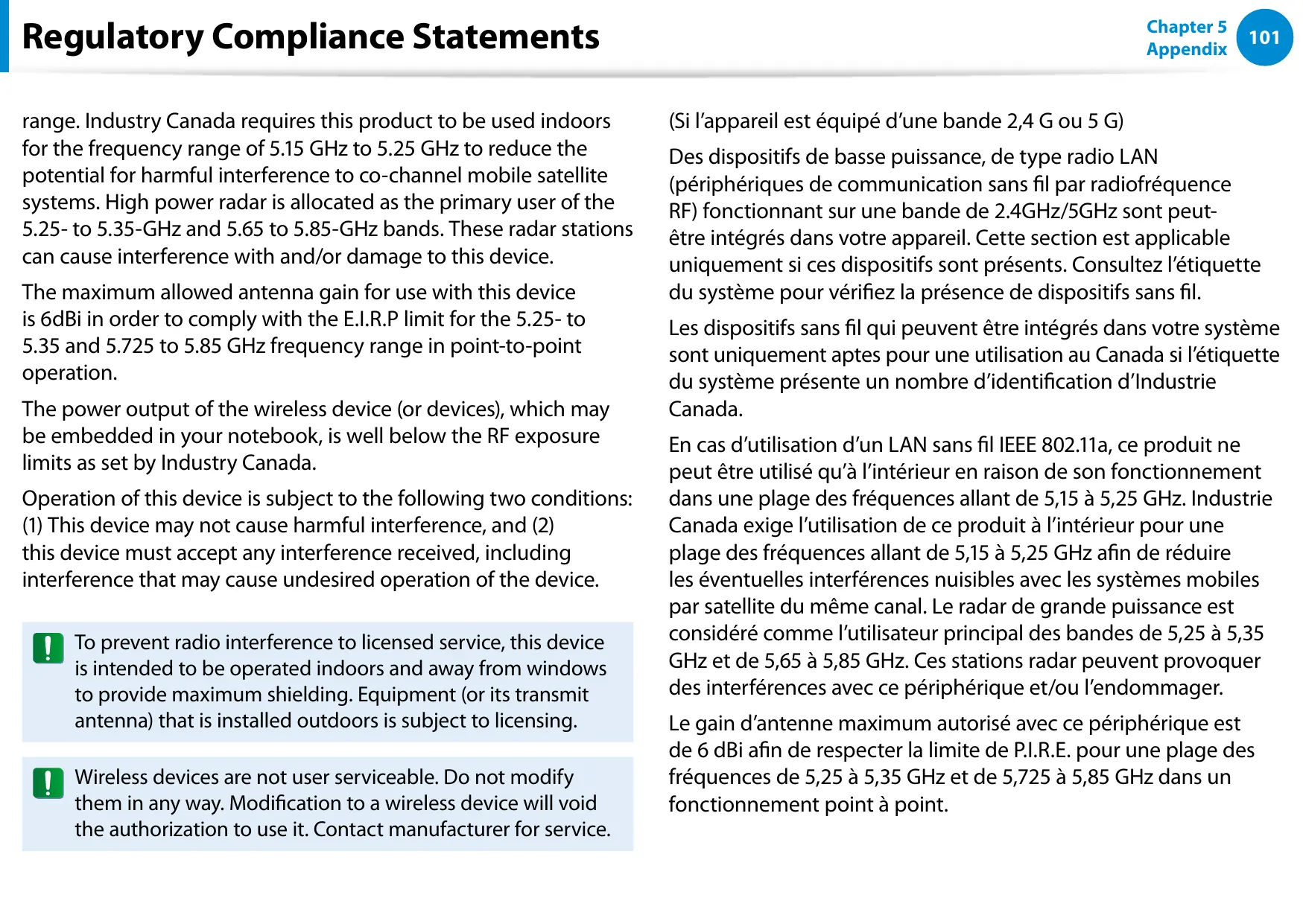 Pour empecher que cet apparéil cause du brouillage au service faisant l'objet d'une licence, il doit être utiliser a l'intérieur et devrait être place loin des fenétres afin de Fournier un ecram de blindage maximal. Si le matriel (ou son antenné d'émission) est installe à l'extérieur, il doit faire l'objet d'une licence.