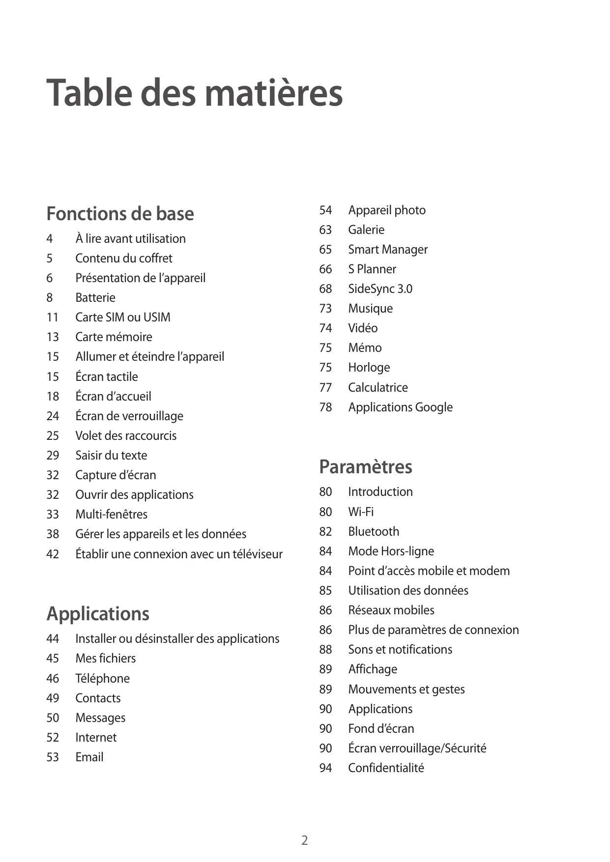À lire avant utilisation Contenu du coffret Présentation de l’appareil Batterie Carte SIM ou USIM Carte mémoire Allumer et éteindre l’appareil Écran tactile Écran d’accueil Écran de verrouillage Volet des raccourcis Saisir du texte Capture d’écran Ouvrir des applications Multi-fenêtres Gérer les appareils et les données Établir une connexion avec un téléviseur Paramètres