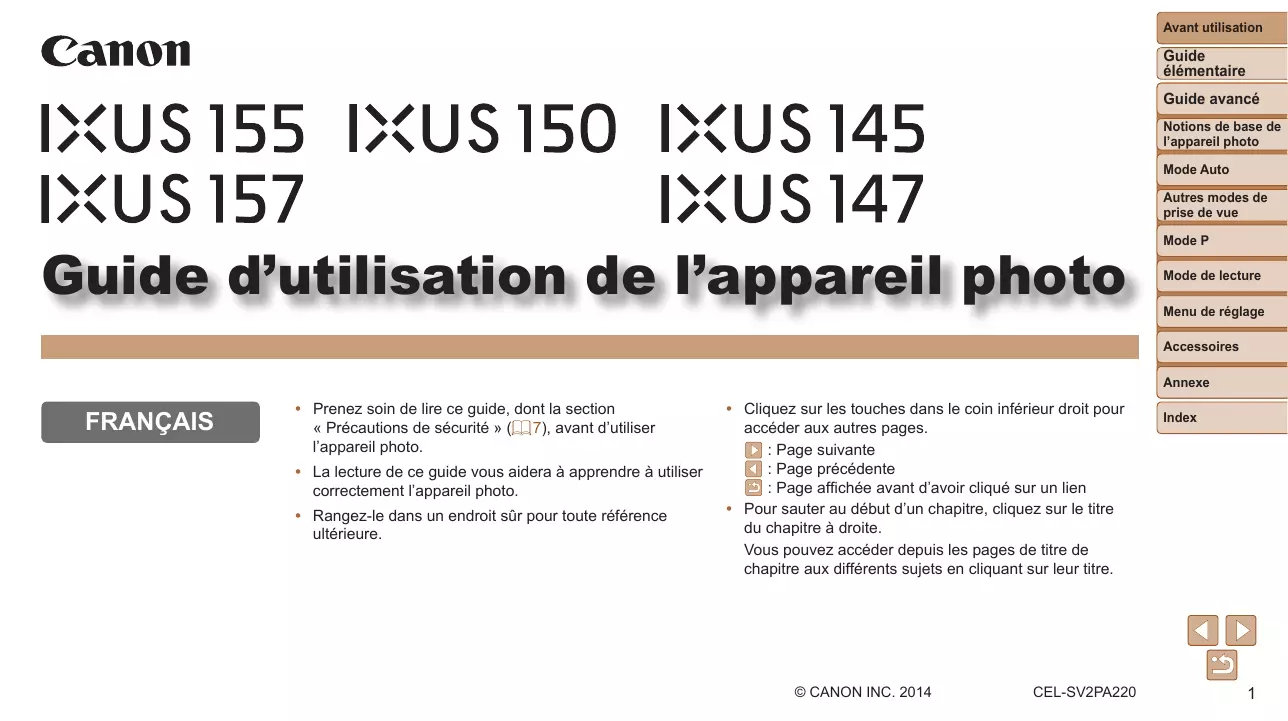 - Pour sauter au début d’un chapitre, cliquez sur le titre du chapitre à droite. Vous pouvez accéder depuis les pages de titre de chapitre aux différents sujets en cliquant sur leur titre. © CANON INC. 2014 CEL-SV2PA220 Index