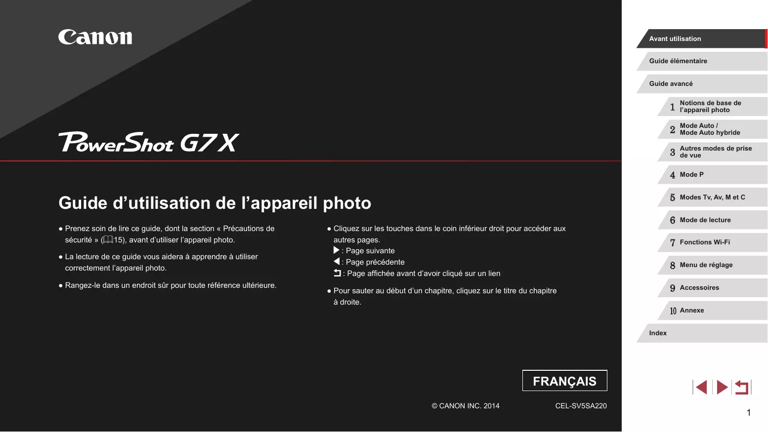 Avant utilisation Guide élémentaire Guide avancé Guide d’utilisation de l’appareil photo ● Prenez soin de lire ce guide, dont la section « Précautions de sécurité » (= 15), avant d’utiliser l’appareil photo. ● La lecture de ce guide vous aidera à apprendre à utiliser correctement l’appareil photo. ● Rangez-le dans un endroit sûr pour toute référence ultérieure. ● Cliquez sur les touches dans le coin inférieur droit pour accéder aux autres pages. : Page suivante : Page précédente : Page affichée avant d’avoir cliqué sur un lien ● Pour sauter au début d’un chapitre, cliquez sur le titre du chapitre à droite.