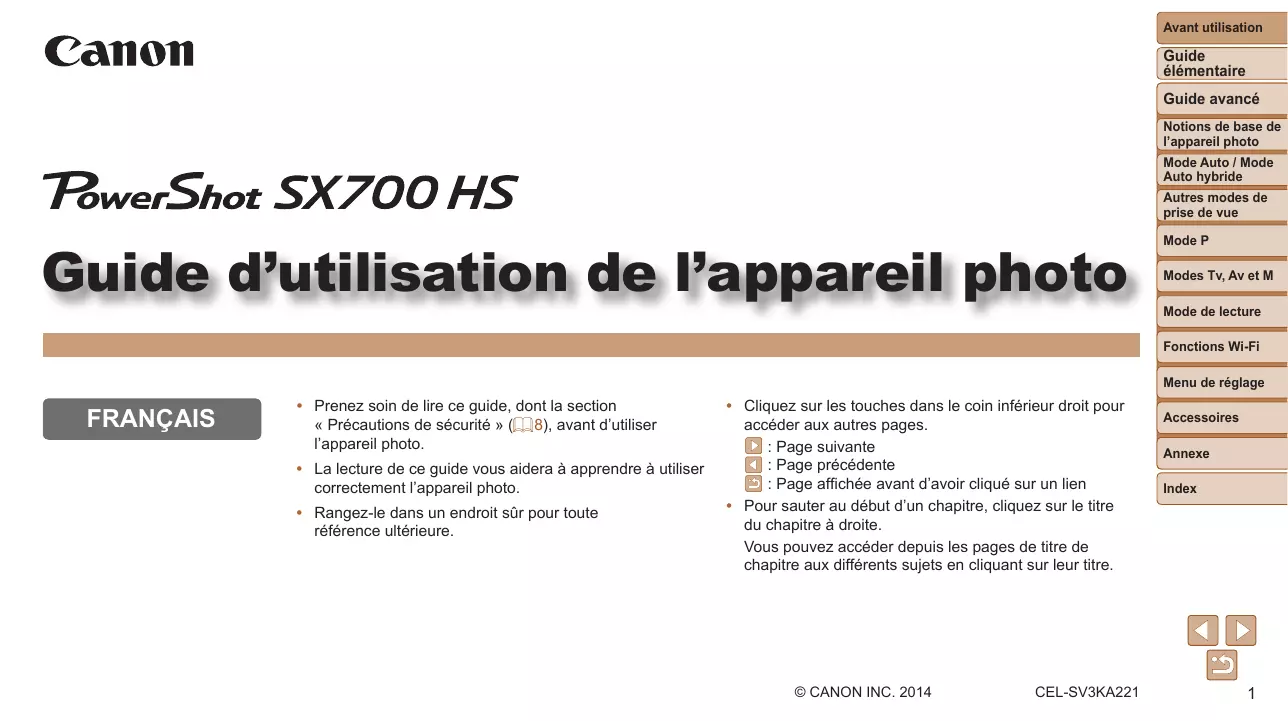 - Pour sauter au début d’un chapitre, cliquez sur le titre du chapitre à droite. Vous pouvez accéder depuis les pages de titre de chapitre aux différents sujets en cliquant sur leur titre. © CANON INC. 2014 CEL-SV3KA221 Accessoires Annexe Index