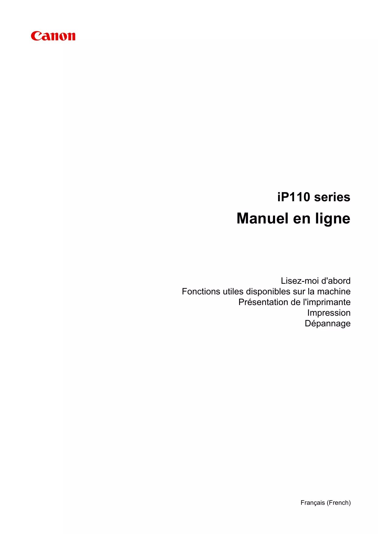 iP110 series Manuel en ligne Lisez-moi d'abord Fonctions utiles disponibles sur la machine Présentation de l'imprimante Impression Dépannage Français (French) Contenu Lisez-moi d'abord. . . . . . . . . . . . . . . . . . . . . . . . . . . . . . . . . . . . . . . . . . . . . . . .