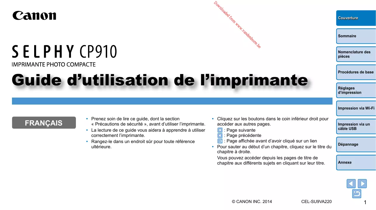 - Pour sauter au début d’un chapitre, cliquez sur le titre du chapitre à droite. Vous pouvez accéder depuis les pages de titre de chapitre aux différents sujets en cliquant sur leur titre. © CANON INC. 2014 CEL-SU9VA220 Impression via un câble USB Dépannage Annexe