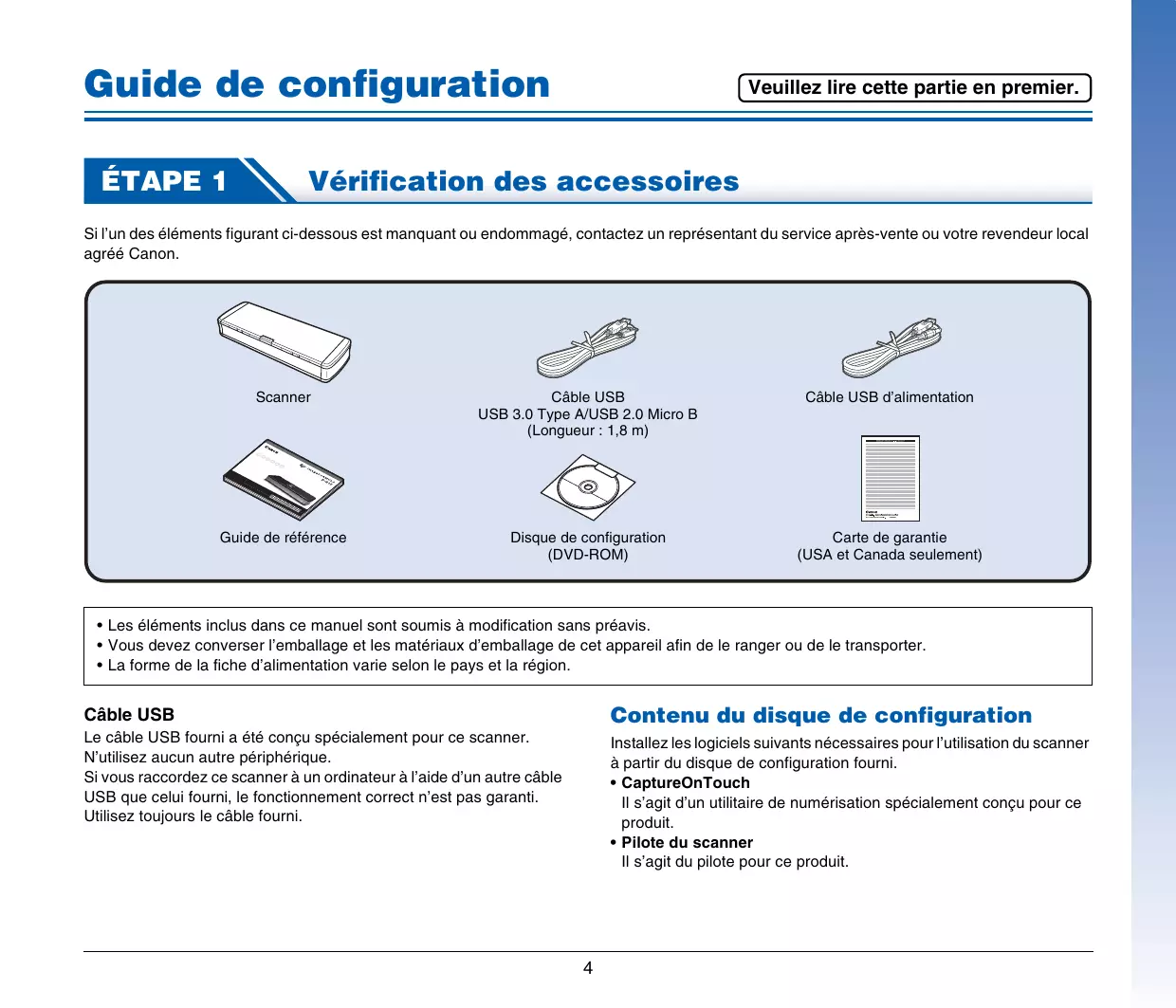 Guide de configuration ÉTAPE 1 Veuillez lire cette partie en premier. Vérification des accessoires Si l’un des éléments figurant ci-dessous est manquant ou endommagé, contactez un représentant du service après-vente ou votre revendeur local agréé Canon. Scanner Câble USB USB 3.0 Type A/USB 2.0 Micro B (Longueur : 1,8 m) Câble USB d’alimentation Guide de référence Disque de configuration (DVD-ROM) Carte de garantie (USA et Canada seulement)