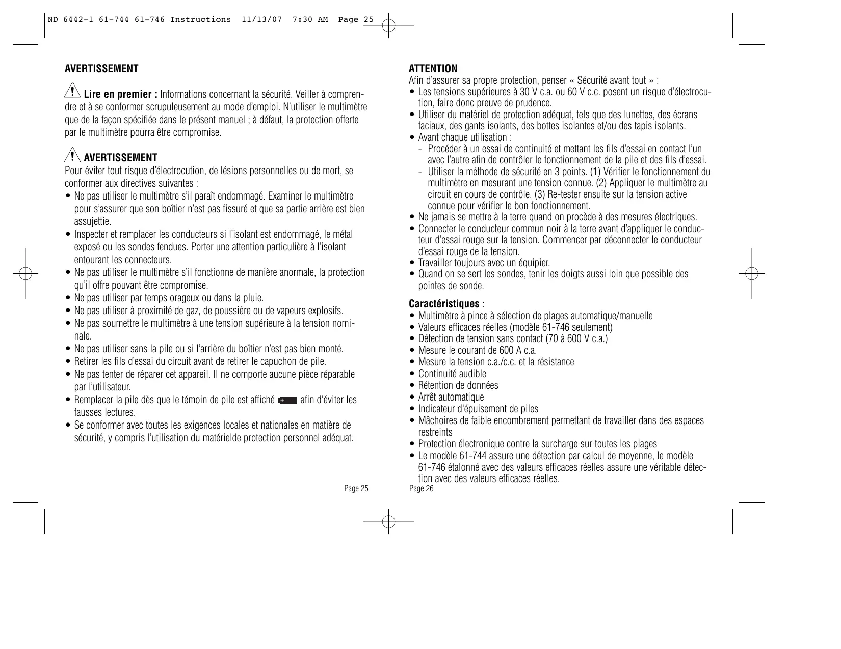 - Nettoyer le boîtier avec un chiffon humide et un détergent doux. N’utiliser ni abrasifs ni solvants. Entretien-dépannage et pièces de rechange : Cet appareil ne comporte pas de pièces réparables par l’utilisateur. En se ce qui concerne les pièces de rechange ou les renseignements concernant Page 31 Page 32 ND 6442-1 61-744 61-746 Instructions Sécurité : 11/13/07 7:30 AM Page 33 Double isolation L’appareil a été évalué et il est conforme à la catégorie d’isolation III (catégorie de surtension III). Degré de pollution 2 conforme à la norme IEC-644. Pour une utilisation à l'intérieur. Fonction Courant c.a. Tension c.a. Plage et résolution Convertisseur c.a. : Le modèle 61-744 assure une détection par calcul de moyenne, le modèle 61-746 étalonné avec des valeurs efficaces réelles assure une véritable détection avec des valeurs efficaces réelles. *Précision énoncée pour facteur de crête < 3. Impédance d'entrée : 10MΩ. Coefficient de température : 0,1 fois la spécification de précision applicable par degré C de 0°C à 18°C et 28°C à 50°C (32°F à 64°F et 82°F à 122°F) Page 33 61-746 Précision : La précision est spécifiée sous la forme d’un +/- (pourcentage de la lecture + une quantité fixe) à 23°C±5°C (73.4°F ± 9°F), moins de 75 % d’humidité relative. 61-744 Protection contre la surcharge Plages et précisions : Précision Page 34 Déclaration de garantie : Ce testeur est garanti à l'acheteur primitif contre tout vice de matière ou de façon pendant deux ans à compter de la date d'achat. Durant cette période de garantie IDEAL INDUSTRIES, INC., à son choix, remplacera ou réparera l'unité défectueuse, suite à la vérification du défaut ou du dysfonctionnement. Cette garantie ne s'applique pas aux fusibles, aux piles ou aux dommages résultant d'une utilisation abusive, de la négligence, d'un accident, d'une réparation non autorisée, d'une modification ou d'une utilisation déraisonnable de l'instrument. Toutes les garanties implicites résultant de la vente d'un produit IDEAL, incluant sans y être limitées les garanties implicites de valeur marchande et d'adaptation à une fin particulière, sont limitées aux conditions ci-dessus. Le fabricant ne sera pas tenu pour responsable de la perte d'usage de l'instrument, ni d'autres dommages accessoires ou indirects, dépenses ou préjudice financier, ou de toute(s) réclamation(s) pour de tels dommages, dépenses ou préjudices. Les lois des provinces varient, donc les limitations et exclusions précédentes peuvent ne pas s'appliquer dans votre cas. Cette garantie vous donne des droits légaux spécifiques, et vous pouvez aussi avoir d'autres droits qui varient d'une province à l'autre.