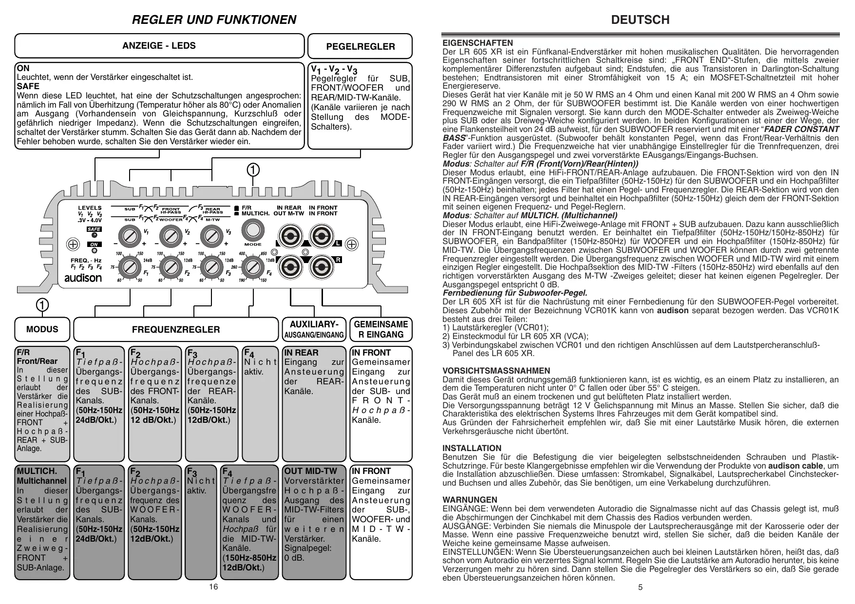 LR 605 XR. C'est un amplificateur à cinq voies aux performances musicales élevées. Les éléments fondamentaux de ce circuit d'exception sont: stades "FRONT END" réalisés avec deux stades différentiels complémentaires, stades finals constitués de transistors en connexion Darlington, transistors finals avec une capacité en courant équivalente à 15 A et une alimentation PWM à MOSFETS à grande réserve d'énergie. L'appareil dispose de quatre voies de 50 W RMS sur 4 Ohm et d'une voie spéciale pour le SUBWOOFER de 200 W RMS sur 4 Ohm et 290 W RMS sur 2 Ohm. Les voies sont soumises à un filtre actif exceptionnel réglabe sur deux ou trois voies par le bouton Mode; dans l'une ou l'autre disposition, une voie, qui a une pente de coupe de 24 dB, est consacrée au SUBWOOFER, qui dispose même de la fonction FADER CONSTANT BASS (niveau constant du Subwoofer lorsque le niveau Front/Rear est varie par le réglage Fader). Le filtre actif dispose de quatre réglages indépendants pour les fréquences de coupe, trois réglages pour les niveaux de sortie, deux connecteurs d'entrée/sortie préamplifiée.