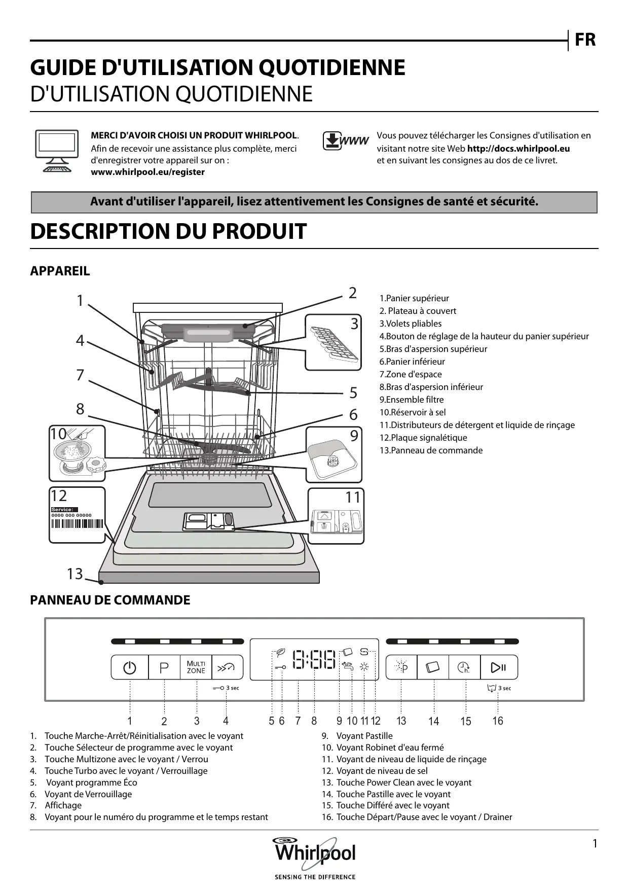 D'UTILISATION QUOTIDIENNE MERCI D'AVOIR CHOISI UN PRODUIT WHIRLPOOL. Afin de recevoir une assistance plus complète, merci d'enregistrer votre appareil sur on : www.whirlpool.eu/register Vous pouvez télécharger les Consignes d'utilisation en visitant notre site Web http://docs.whirlpool.eu et en suivant les consignes au dos de ce livret. Avant d'utiliser l'appareil, lisez attentivement les Consignes de santé et sécurité.