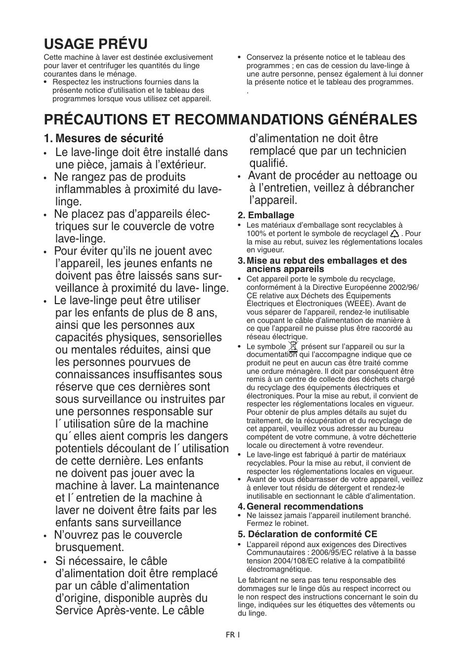 - L’appareil répond aux exigences des Directives Communautaires : 2006/95/EC relative à la basse tension 2004/108/EC relative à la compatibilité électromagnétique. Le fabricant ne sera pas tenu responsable des dommages sur le linge dûs au respect incorrect ou le non respect des instructions concernant le soin du linge, indiquées sur les étiquettes des vêtements ou du linge. FR 1