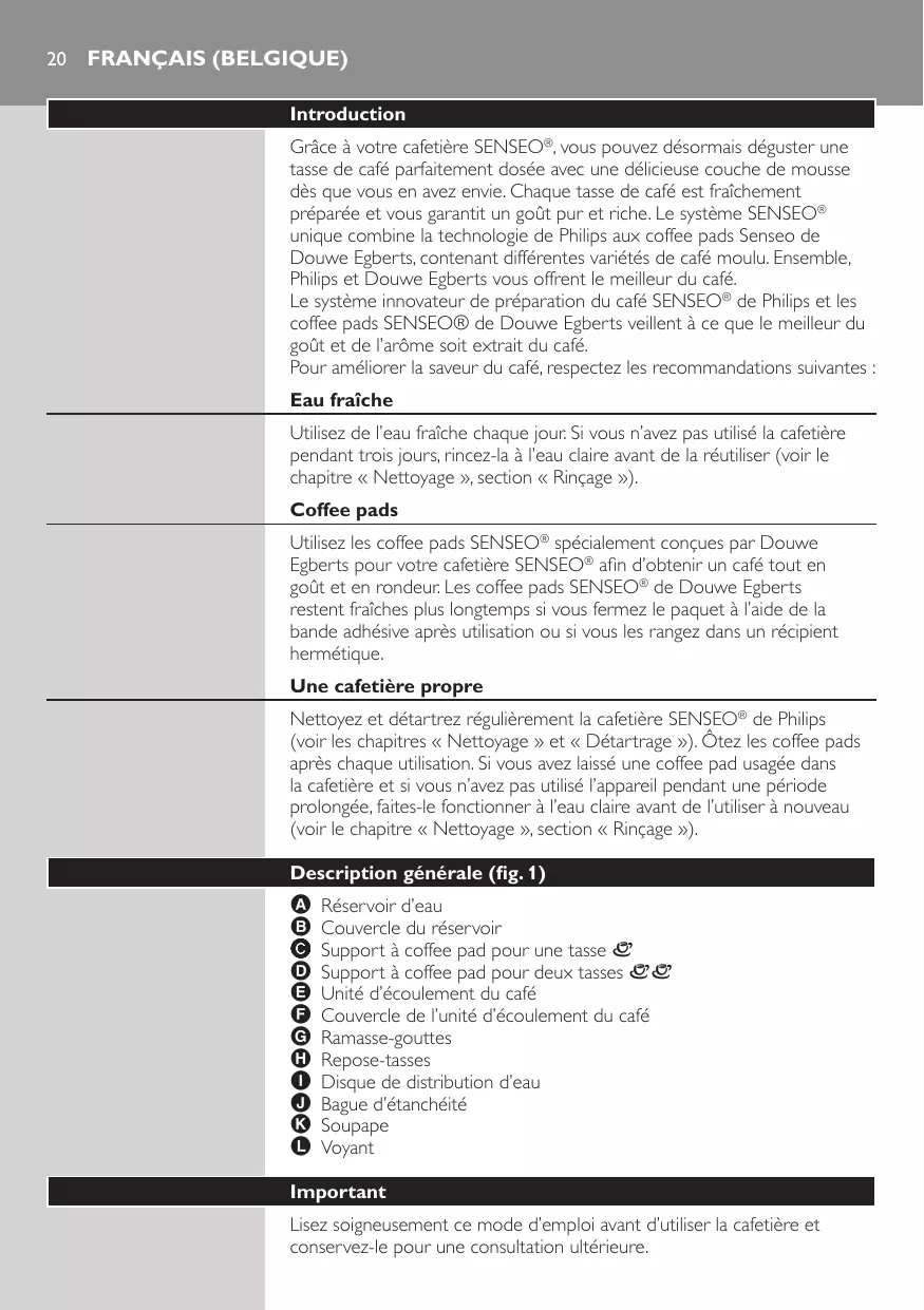 Français (Belgique) Introduction Grâce à votre cafetière SENSEO®, vous pouvez désormais déguster une tasse de café parfaitement dosée avec une délicieuse couche de mousse dès que vous en avez envie. Chaque tasse de café est fraîchement préparée et vous garantit un goût pur et riche. Le système SENSEO® unique combine la technologie de Philips aux coffee pads Senseo de Douwe Egberts, contenant différentes variétés de café moulu. Ensemble, Philips et Douwe Egberts vous offrent le meilleur du café. Le système innovateur de préparation du café SENSEO® de Philips et les coffee pads SENSEO® de Douwe Egberts veillent à ce que le meilleur du goût et de l’arôme soit extrait du café. Pour améliorer la saveur du café, respectez les recommandations suivantes : Eau fraîche Utilisez de l’eau fraîche chaque jour. Si vous n’avez pas utilisé la cafetière pendant trois jours, rincez-la à l’eau claire avant de la réutiliser (voir le chapitre « Nettoyage », section « Rinçage »). Coffee pads Utilisez les coffee pads SENSEO® spécialement conçues par Douwe Egberts pour votre cafetière SENSEO® afin d’obtenir un café tout en goût et en rondeur. Les coffee pads SENSEO® de Douwe Egberts restent fraîches plus longtemps si vous fermez le paquet à l’aide de la bande adhésive après utilisation ou si vous les rangez dans un récipient hermétique. Une cafetière propre Nettoyez et détartrez régulièrement la cafetière SENSEO® de Philips (voir les chapitres « Nettoyage » et « Détartrage »). Ôtez les coffee pads après chaque utilisation. Si vous avez laissé une coffee pad usagée dans la cafetière et si vous n’avez pas utilisé l’appareil pendant une période prolongée, faites-le fonctionner à l’eau claire avant de l’utiliser à nouveau (voir le chapitre « Nettoyage », section « Rinçage »). Description générale (fig. 1)