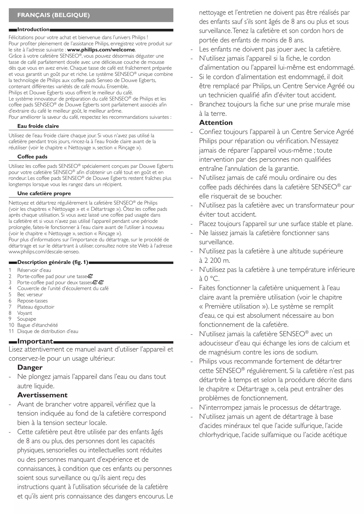 Une cafetière propre Nettoyez et détartrez régulièrement la cafetière SENSEO® de Philips (voir les chapitres « Nettoyage » et « Détartrage »). Ôtez les coffee pads après chaque utilisation. Si vous avez laissé une coffee pad usagée dans la cafetière et si vous n’avez pas utilisé l’appareil pendant une période prolongée, faites-le fonctionner à l’eau claire avant de l’utiliser à nouveau (voir le chapitre « Nettoyage », section « Rinçage »). Pour plus d’informations sur l’importance du détartrage, sur le procédé de détartrage et sur le détartrant à utiliser, consultez notre site Web à l’adresse www.philips.com/descale-senseo. Description générale (fig. 1) 1 Réservoir d’eau 2 Porte-coffee pad pour une tasse° 3 Porte-coffee pad pour deux tasses°° 4 Couvercle de l’unité d’écoulement du café 5 Bec verseur 6 Repose-tasses 7 Plateau égouttoir 8 Voyant 9 Soupape 10 Bague d’étanchéité 11 Disque de distribution d’eau Important Lisez attentivement ce manuel avant d’utiliser l’appareil et conservez-le pour un usage ultérieur. Danger -- Ne plongez jamais l’appareil dans l’eau ou dans tout autre liquide. Avertissement -- Avant de brancher votre appareil, vérifiez que la tension indiquée au fond de la cafetière correspond bien à la tension secteur locale. -- Cette cafetière peut être utilisée par des enfants âgés de 8 ans ou plus, des personnes dont les capacités physiques, sensorielles ou intellectuelles sont réduites ou des personnes manquant d’expérience et de connaissances, à condition que ces enfants ou personnes soient sous surveillance ou qu’ils aient reçu des instructions quant à l’utilisation sécurisée de la cafetière et qu’ils aient pris connaissance des dangers encourus. Le