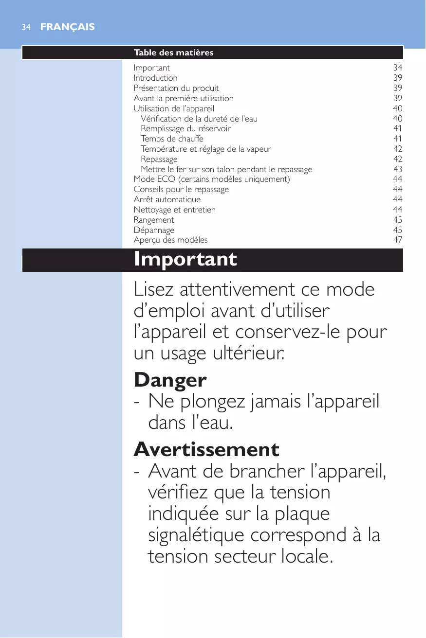 Vérification de la dureté de l’eau Remplissage du réservoir Temps de chauffe Température et réglage de la vapeur Repassage Mettre le fer sur son talon pendant le repassage Mode ECO (certains modèles uniquement) Conseils pour le repassage Arrêt automatique Nettoyage et entretien Rangement Dépannage Aperçu des modèles