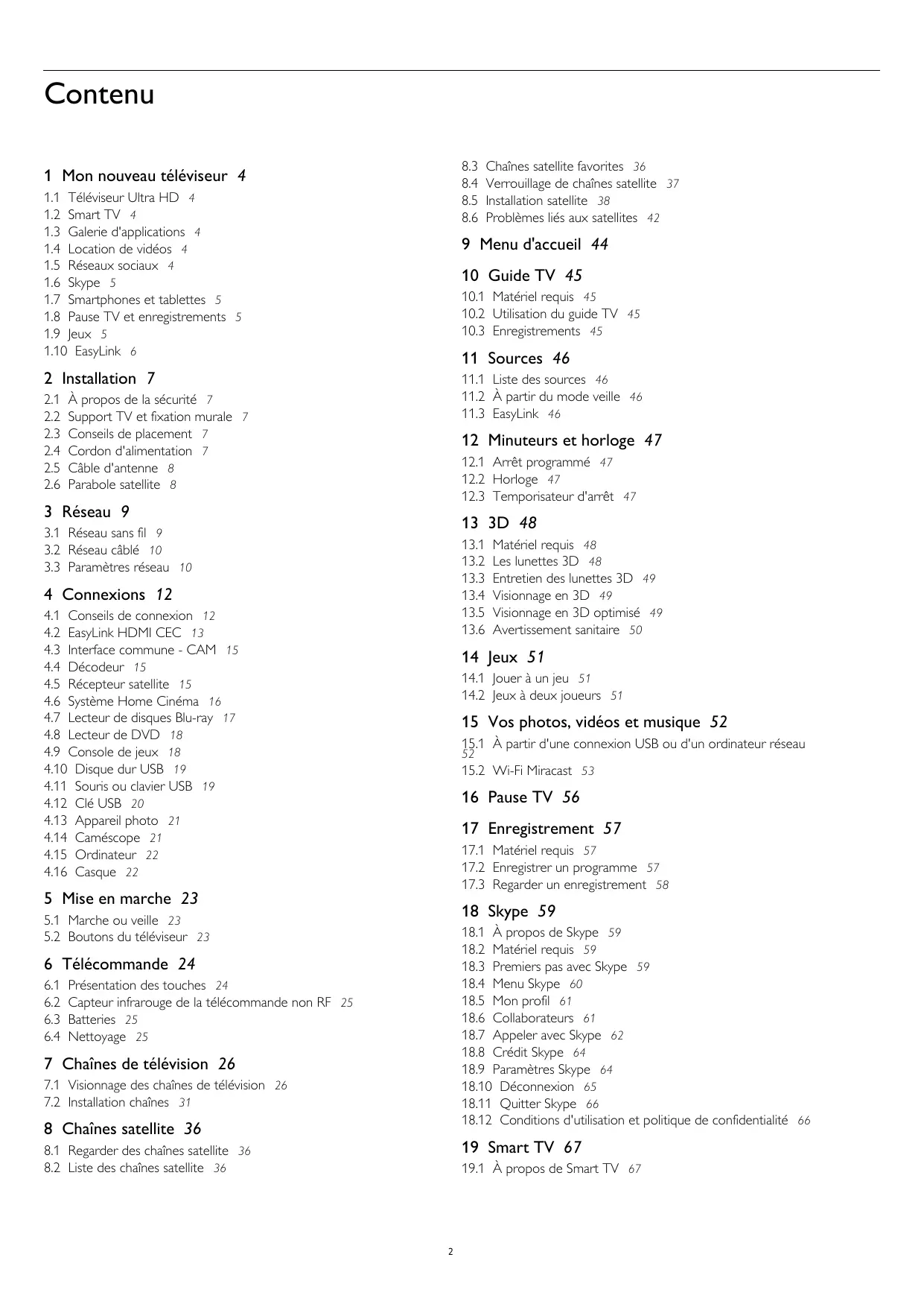 1 Mon nouveau téléviseur 4 1.1 Téléviseur Ultra HD 4 1.2 Smart TV 4 1.3 Galerie d'applications 4 1.4 Location de vidéos 4 1.5 Réseaux sociaux 4 1.6 Skype 5 1.7 Smartphones et tablettes 5 1.8 Pause TV et enregistrements 5 1.9 Jeux 5 1.10 EasyLink 6
