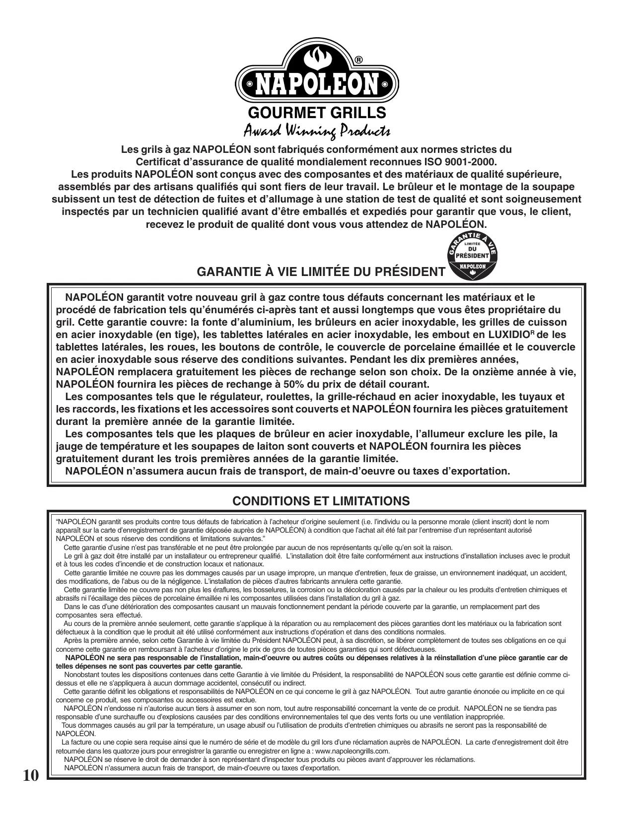 GARANTIE À VIE LIMITÉE DU PRÉSIDENT NAPOLÉON garantit votre nouveau gril à gaz contre tous défauts concernant les matériaux et le procédé de fabrication tels qu’énumérés ci-après tant et aussi longtemps que vous êtes propriétaire du gril. Cette garantie couvre: la fonte d’aluminium, les brûleurs en acier inoxydable, les grilles de cuisson en acier inoxydable (en tige), les tablettes latérales en acier inoxydable, les embout en LUXIDIOR de les tablettes latérales, les roues, les boutons de contrôle, le couvercle de porcelaine émaillée et le couvercle en acier inoxydable sous réserve des conditions suivantes. Pendant les dix premières années, NAPOLÉON remplacera gratuitement les pièces de rechange selon son choix. De la onzième année à vie, NAPOLÉON fournira les pièces de rechange à 50% du prix de détail courant. Les composantes tels que le régulateur, roulettes, la grille-réchaud en acier inoxydable, les tuyaux et les raccords, les fixations et les accessoires sont couverts et NAPOLÉON fournira les pièces gratuitement durant la première année de la garantie limitée. Les composantes tels que les plaques de brûleur en acier inoxydable, l’allumeur exclure les pile, la jauge de température et les soupapes de laiton sont couverts et NAPOLÉON fournira les pièces gratuitement durant les trois premières années de la garantie limitée. NAPOLÉON n’assumera aucun frais de transport, de main-d’oeuvre ou taxes d’exportation.