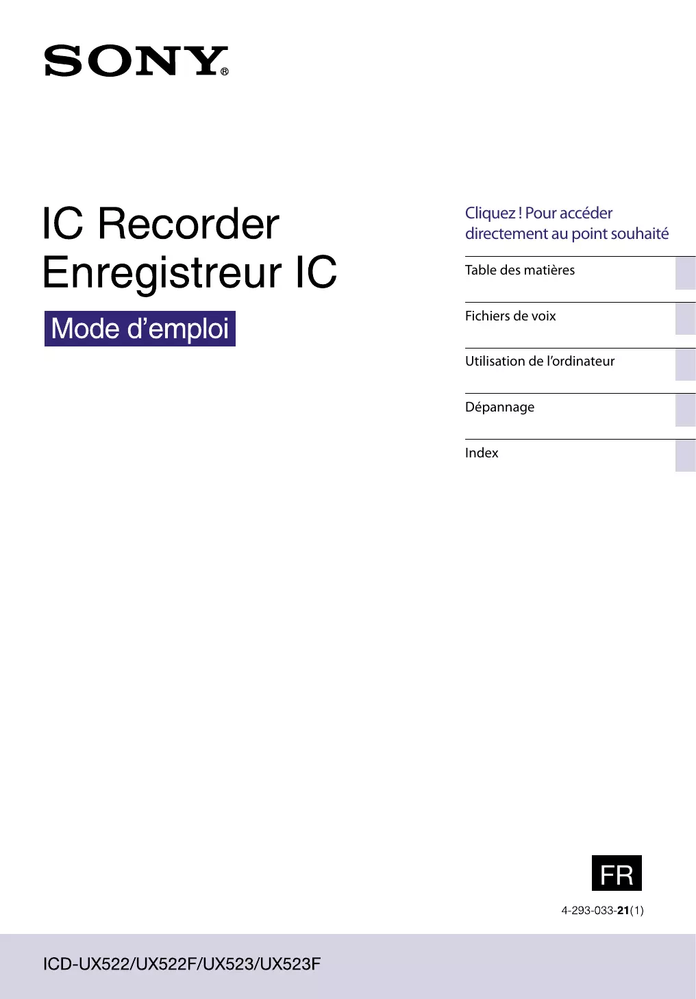 Réception FM*3 Environ 11 h h : heures/min : minutes *1 L’autonomie de la pile est mesurée lors des tests exécutés avec des méthodes détenues par Sony. L’autonomie de la pile peut être plus courte selon les conditions d’utilisation de l’enregistreur IC. *2 En mode de lecture via le haut-parleur interne avec un volume réglé sur 13 *3 modèles ICD-UX522F/UX523F uniquement Index LPCM 44.1kHz/16bit Table des matières Autonomie de la pile