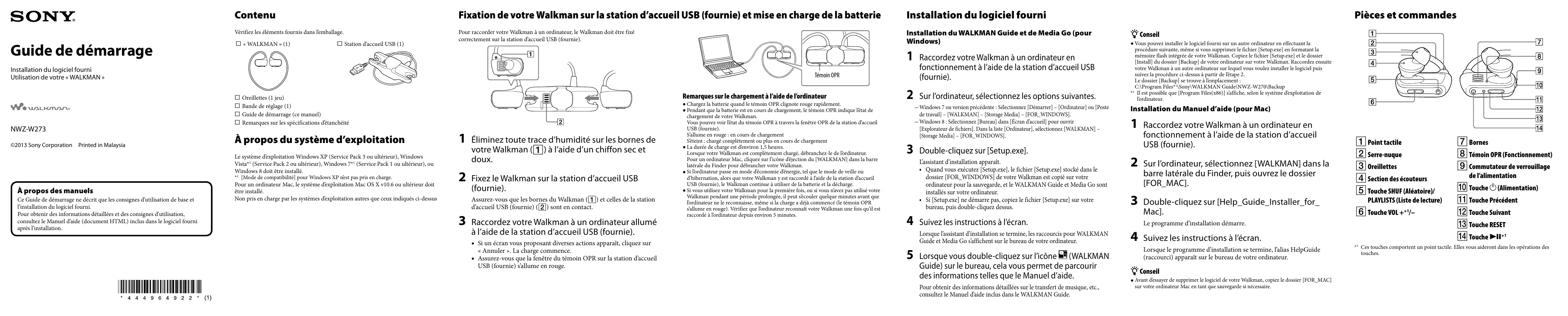Double-cliquez sur [Setup.exe]. L’assistant d’installation apparaît. Quand vous exécutez [Setup.exe], le fichier [Setup.exe] stocké dans le dossier [FOR_WINDOWS] de votre Walkman est copié sur votre ordinateur pour la sauvegarde, et le WALKMAN Guide et Media Go sont installés sur votre ordinateur. Si [Setup.exe] ne démarre pas, copiez le fichier [Setup.exe] sur votre bureau, puis double-cliquez dessus. Pièces et commandes Conseil Vous pouvez installer le logiciel fourni sur un autre ordinateur en effectuant la procédure suivante, même si vous supprimez le fichier [Setup.exe] en formatant la mémoire flash intégrée de votre Walkman. Copiez le fichier [Setup.exe] et le dossier [Install] du dossier [Backup] de votre ordinateur sur votre Walkman. Raccordez ensuite votre Walkman à un autre ordinateur sur lequel vous voulez installer le logiciel puis suivez la procédure ci-dessus à partir de l’étape 2. Le dossier [Backup] se trouve à l’emplacement : C:\Program Files*1\Sony\WALKMAN Guide\NWZ-W270\Backup *1 Il est possible que [Program Files(x86)] s’affiche, selon le système d’exploitation de l’ordinateur. Installation du Manuel d’aide (pour Mac)
