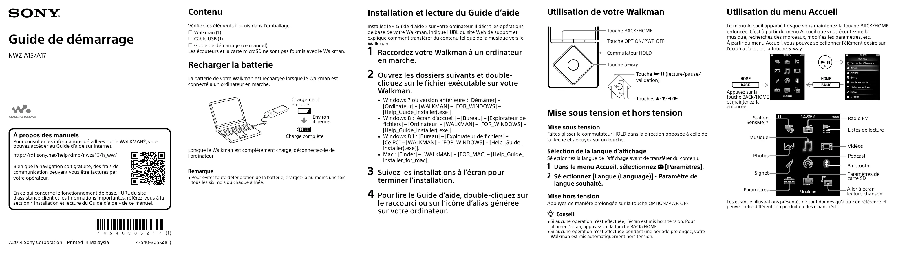 Pour lire le Guide d’aide, double-cliquez sur le raccourci ou sur l’icône d’alias générée sur votre ordinateur. Mise sous tension et hors tension Mise sous tension Faites glisser le commutateur HOLD dans la direction opposée à celle de la flèche et appuyez sur un touche. Sélectionnez la langue de l’affichage avant de transférer du contenu. Dans le menu Accueil, sélectionnez 4-540-305-21(1) Radio FM Listes de lecture Musique Photos Sélectionnez [Langue (Language)] - Paramètre de langue souhaité. Mise hors tension Appuyez de manière prolongée sur la touche OPTION/PWR OFF. ¼¼Conseil Podcast Bluetooth [Paramètres]. ˎˎSi aucune opération n’est effectuée, l’écran est mis hors tension. Pour allumer l’écran, appuyez sur la touche BACK/HOME. ˎˎSi aucune opération n’est effectuée pendant une période prolongée, votre Walkman est mis automatiquement hors tension. ©2014 Sony Corporation Printed in Malaysia Station SensMe™ Vidéos Sélection de la langue d’affichage