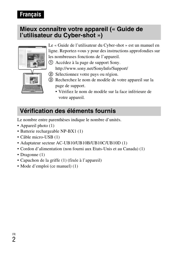 : Intelligent Auto : Movie Mode Français Mieux connaître votre appareil (« Guide de l’utilisateur du Cyber-shot ») Le « Guide de l’utilisateur du Cyber-shot » est un manuel en ligne. Reportez-vous y pour des instructions approfondies sur les nombreuses fonctions de l’appareil. 1 Accédez à la page de support Sony. http://www.sony.net/SonyInfo/Support/ 2 Sélectionnez votre pays ou région. 3 Recherchez le nom de modèle de votre appareil sur la page de support.