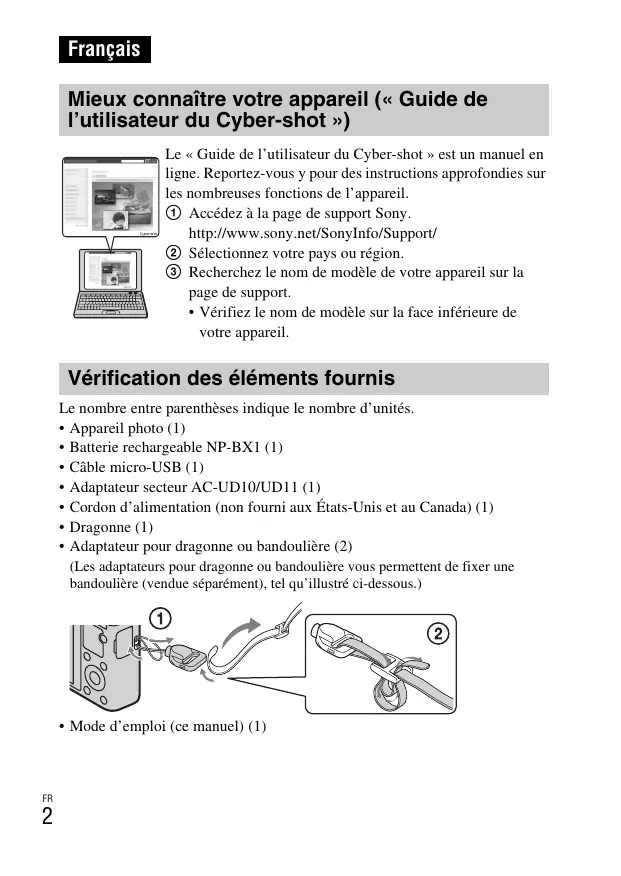 : Intelligent Auto : Movie Français Mieux connaître votre appareil (« Guide de l’utilisateur du Cyber-shot ») Le « Guide de l’utilisateur du Cyber-shot » est un manuel en ligne. Reportez-vous y pour des instructions approfondies sur les nombreuses fonctions de l’appareil. 1 Accédez à la page de support Sony. http://www.sony.net/SonyInfo/Support/ 2 Sélectionnez votre pays ou région. 3 Recherchez le nom de modèle de votre appareil sur la page de support.
