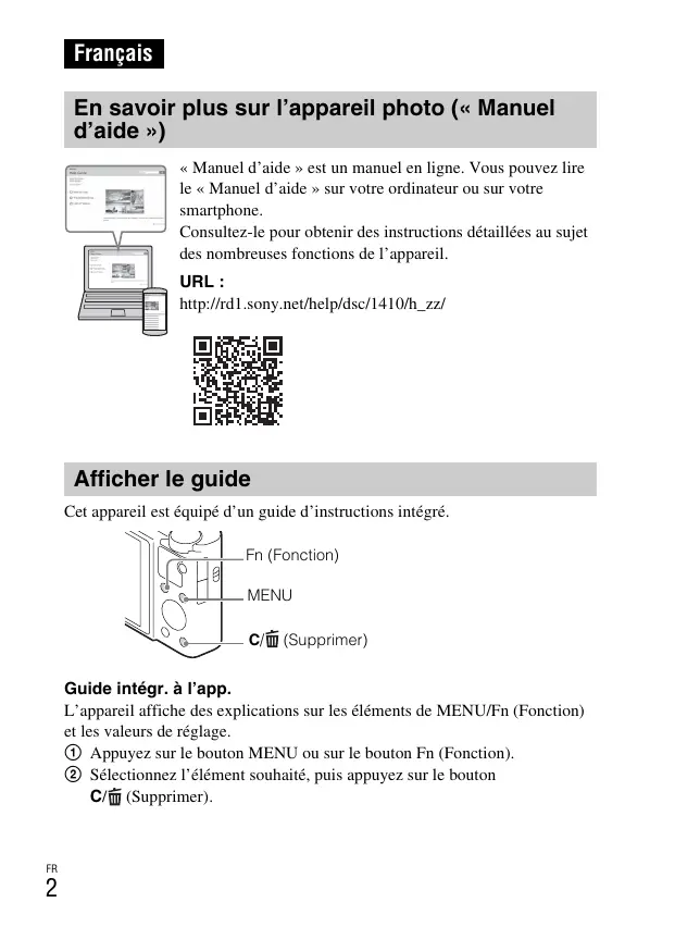 : Intelligent Auto : Movie MOVIE Français En savoir plus sur l’appareil photo (« Manuel d’aide ») « Manuel d’aide » est un manuel en ligne. Vous pouvez lire le « Manuel d’aide » sur votre ordinateur ou sur votre smartphone. Consultez-le pour obtenir des instructions détaillées au sujet des nombreuses fonctions de l’appareil. URL : http://rd1.sony.net/help/dsc/1410/h_zz/ Afficher le guide Cet appareil est équipé d’un guide d’instructions intégré. Fn (Fonction) MENU