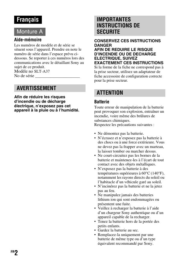 Français Monture A Aide-mémoire Les numéros de modèle et de série se situent sous l’appareil. Prendre en note le numéro de série dans l’espace prévu cidessous. Se reporter à ces numéros lors des communications avec le détaillant Sony au sujet de ce produit. Modèle no SLT-A37 No de série ______________________ AVERTISSEMENT Afin de réduire les risques d’incendie ou de décharge électrique, n’exposez pas cet appareil à la pluie ou à l’humidité. IMPORTANTES INSTRUCTIONS DE SECURITE