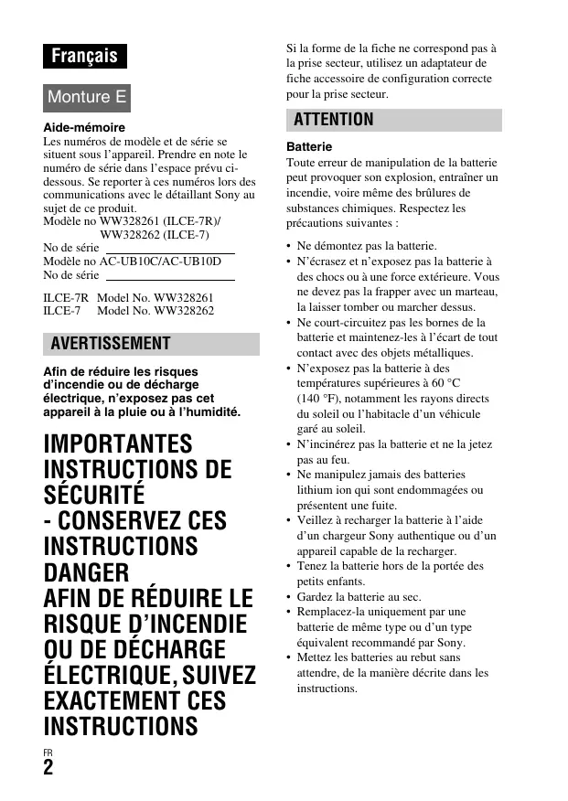Monture E Aide-mémoire Les numéros de modèle et de série se situent sous l’appareil. Prendre en note le numéro de série dans l’espace prévu cidessous. Se reporter à ces numéros lors des communications avec le détaillant Sony au sujet de ce produit. Modèle no WW328261 (ILCE-7R)/ WW328262 (ILCE-7) No de série Modèle no AC-UB10C/AC-UB10D No de série ILCE-7R Model No. WW328261 ILCE-7 Model No. WW328262