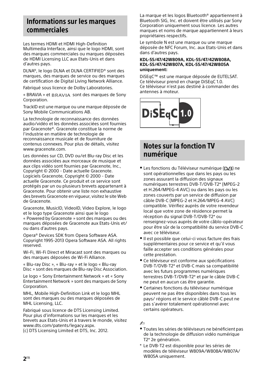uniquement: DiSEqC™ est une marque déposée de EUTELSAT. Ce téléviseur prend en charge DiSEqC 1.0. Ce téléviseur n’est pas destiné à commander des antennes à moteur. TrackID est une marque ou une marque déposée de Sony Mobile Communications AB. La technologie de reconnaissance des données audio/vidéo et les données associées sont fournies par Gracenote®. Gracenote constitue la norme de l’industrie en matière de technologie de reconnaissance musicale et de fourniture de contenus connexes. Pour plus de détails, visitez www.gracenote.com. Les données sur CD, DVD ou/et Blu-ray Disc et les données associées aux morceaux de musique et aux clips vidéo sont fournies par Gracenote, Inc., Copyright © 2000 - Date actuelle Gracenote. Logiciels Gracenote, Copyright © 2000 - Date actuelle Gracenote. Ce produit et ce service sont protégés par un ou plusieurs brevets appartenant à Gracenote. Pour obtenir une liste non exhaustive des brevets Gracenote en vigueur, visitez le site Web de Gracenote. Gracenote, MusicID, VideoID, Video Explore, le logo et le logo type Gracenote ainsi que le logo « Powered by Gracenote » sont des marques ou des marques déposées de Gracenote aux Etats-Unis et/ ou dans d’autres pays. Opera® Devices SDK from Opera Software ASA. Copyright 1995-2013 Opera Software ASA. All rights reserved. Wi-Fi, Wi-Fi Direct et Miracast sont des marques ou des marques déposées de Wi-Fi Alliance. « Blu-ray Disc », « Blu-ray » et le logo « Blu-ray Disc » sont des marques de Blu-ray Disc Association. Le logo « Sony Entertainment Network » et « Sony Entertainment Network » sont des marques de Sony Corporation. MHL, Mobile High-Definition Link et le logo MHL sont des marques ou des marques déposées de MHL Licensing, LLC. Fabriqué sous licence de DTS Licensing Limited. Pour plus d’informations sur les marques et les brevets aux Etats-Unis et à travers le monde, visitez www.dts.com/patents/legacy.aspx. (c) DTS Licensing Limited et DTS, Inc. 2012. 2FR Notes sur la fonction TV numérique Les fonctions du Téléviseur numérique ( ) ne sont opérationnelles que dans les pays ou les zones assurant la diffusion des signaux numériques terrestres DVB-T/DVB-T2* (MPEG-2 et H.264/MPEG-4 AVC) ou dans les pays ou les zones couverts par un service de diffusion par câble DVB-C (MPEG-2 et H.264/MPEG-4 AVC) compatible. Vérifiez auprès de votre revendeur local que votre zone de résidence permet la réception du signal DVB-T/DVB-T2* ou renseignez-vous auprès de votre câblo-opérateur pour être sûr de la compatibilité du service DVB-C avec ce téléviseur. Il est possible que celui-ci vous facture des frais supplémentaires pour ce service et qu’il vous faille accepter ses conditions générales pour cette prestation. Ce téléviseur est conforme aux spécifications DVB-T/DVB-T2* et DVB-C mais sa compatibilité avec les futurs programmes numériques terrestres DVB-T/DVB-T2* et par le câble DVB-C ne peut en aucun cas être garantie. Certaines fonctions du téléviseur numérique peuvent ne pas être disponibles dans tous les pays/ régions et le service câblé DVB-C peut ne pas s’avérer totalement opérationnel avec certains opérateurs. Toutes les séries de téléviseurs ne bénéficient pas de la technologie de diffusion vidéo numérique T2* 2e génération.